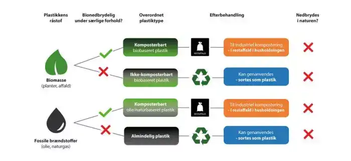 Uanset hvad plastikken består af (når vi kun taler om ikke-komposterbar plastik), er der ingen grundlæggende kemisk forskel på de fremstillede plastik-polymerer. Det vil sige, du ender med samme plastikprodukt uanset om det er lavet af olie eller planter. Derfor skal den biobaserede (ikke-komposterbare) plastik og almindelig konventionel plastik sorteres på samme måde som plast.