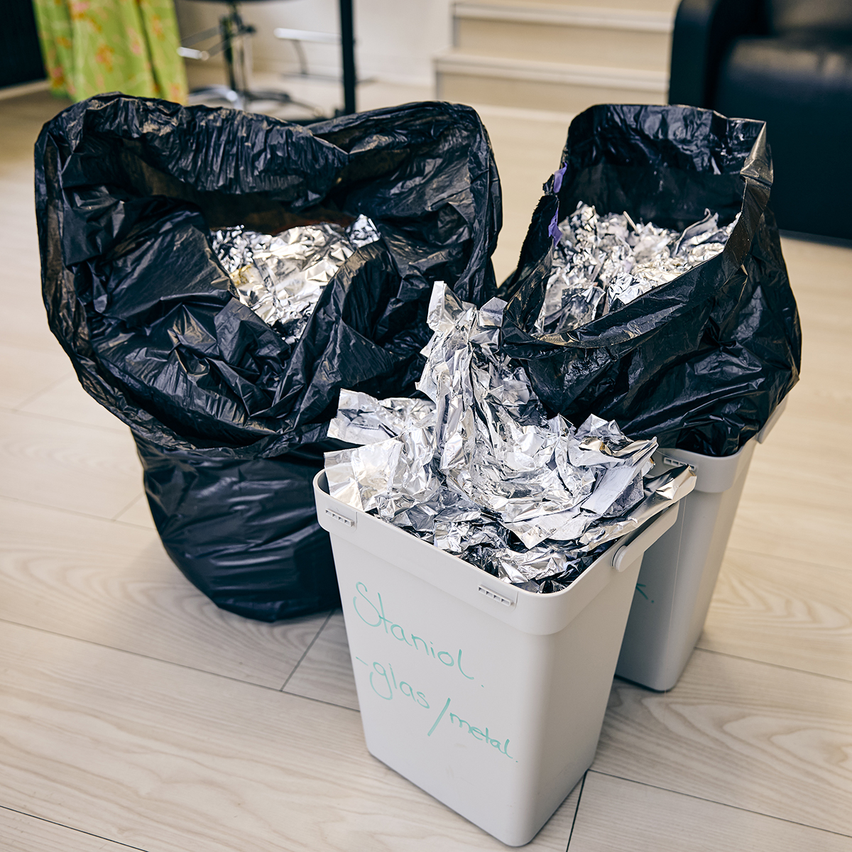 ”Når stanniolen er færdig med at sidde i kundens hår, lægger vi det i vores kasse til metal og glas, så det kan blive sorteret som metalaffald. Hvis det bare ryger ud med restaffaldet, kan det jo ikke bruges igen – og det er der jo ingen der får glæde af,” siger indehaver Gitte Fodgaard.