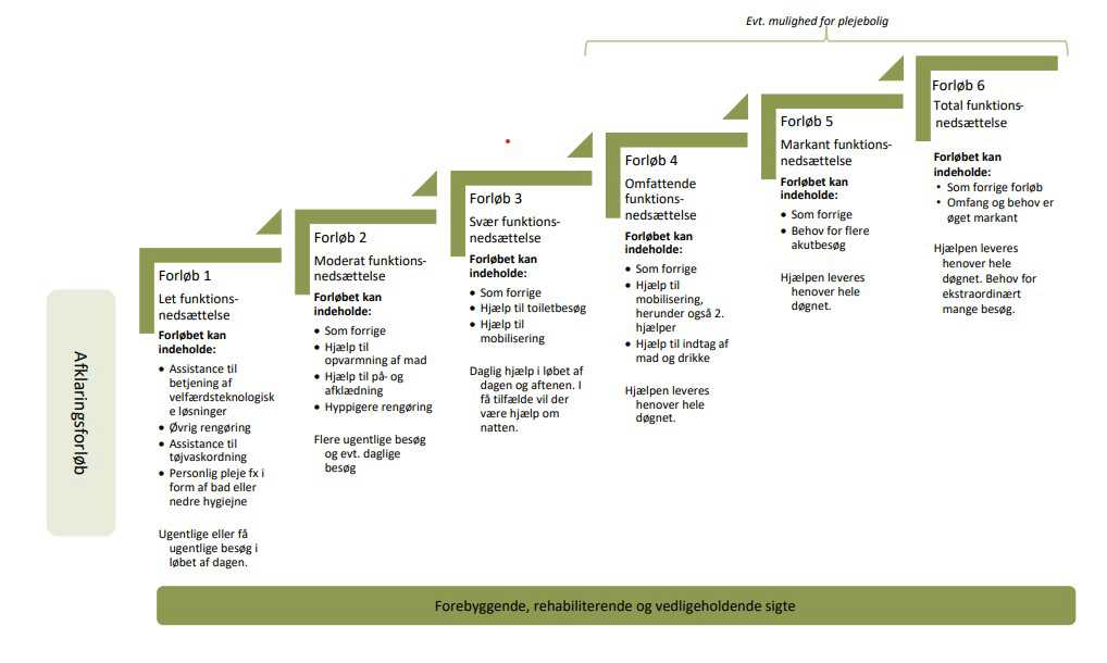 I Randers Kommune er der seks forskellige pleje- og omsorgsforløb samt et forudgående afklaringsforløb, hvor dine behov og ønsker afdækkes i samarbejde med medarbejderne. Pleje- og omsorgsforløbene er opbygget med et stigende behov for omsorg og pleje ud fra den enkeltes funktionsniveau. Har du f.eks. et mindre behov for pleje og omsorg, vil du visiteres til forløb 1, og har du et ekstraordinært behov for pleje og omsorg, vil du visiteres til forløb 6.