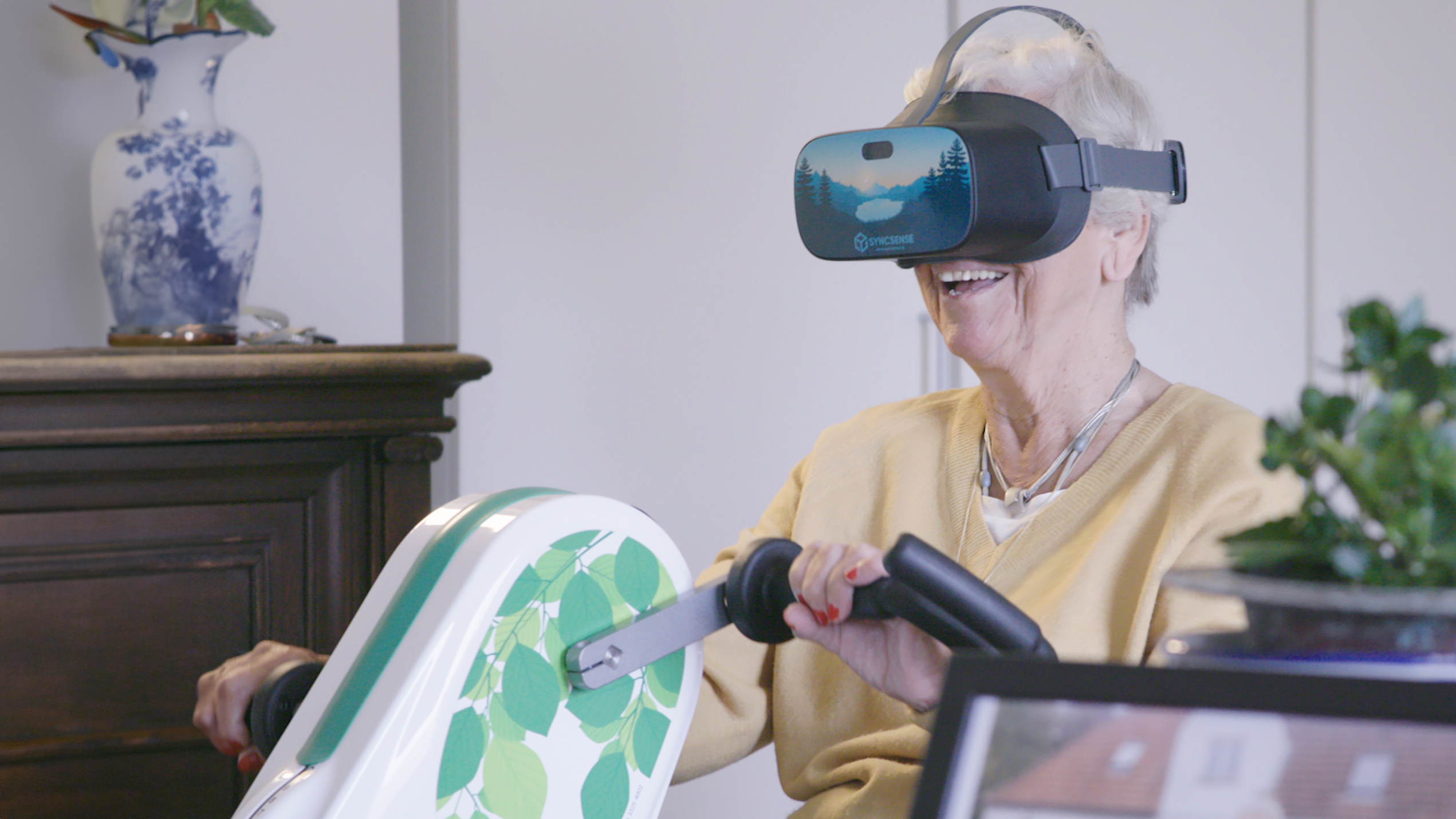 Terapeuter på plejecentre i Randers Kommune afprøver træning med virtual reality (VR). Denne digitale træningsteknologi understøtter træning med motiverende og meningsfulde naturoplevelser gennem VR-briller der kan forbindes med en sensor på træningsudstyret.