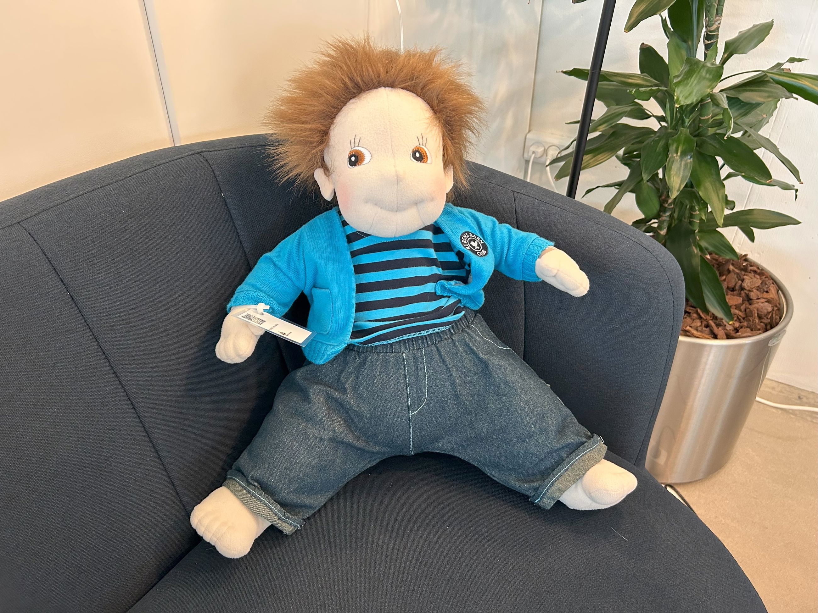 Dukken er lavet i en blød polyester fleece, og er fyldt med polyester fibre. Bunden er fyldt med granulat, som gør, at dukken har en god tyngde, og dermed sidder bedre.