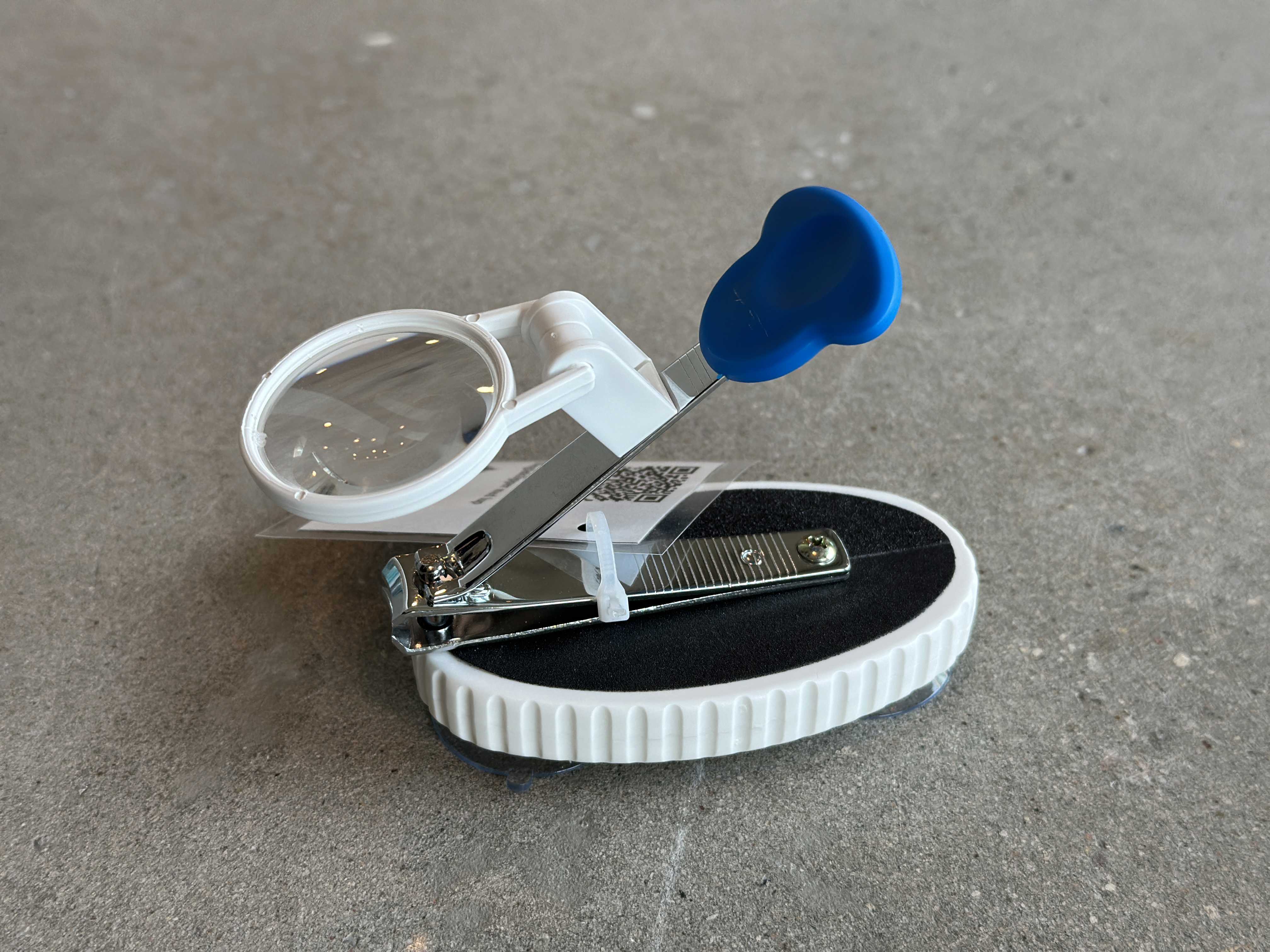 Den er især velegnet til mennesker med nedsat kraft i hænderne eller ved rystelser. Ved hjælp af luppen bliver negleklipning også muligt for svagtseende.
