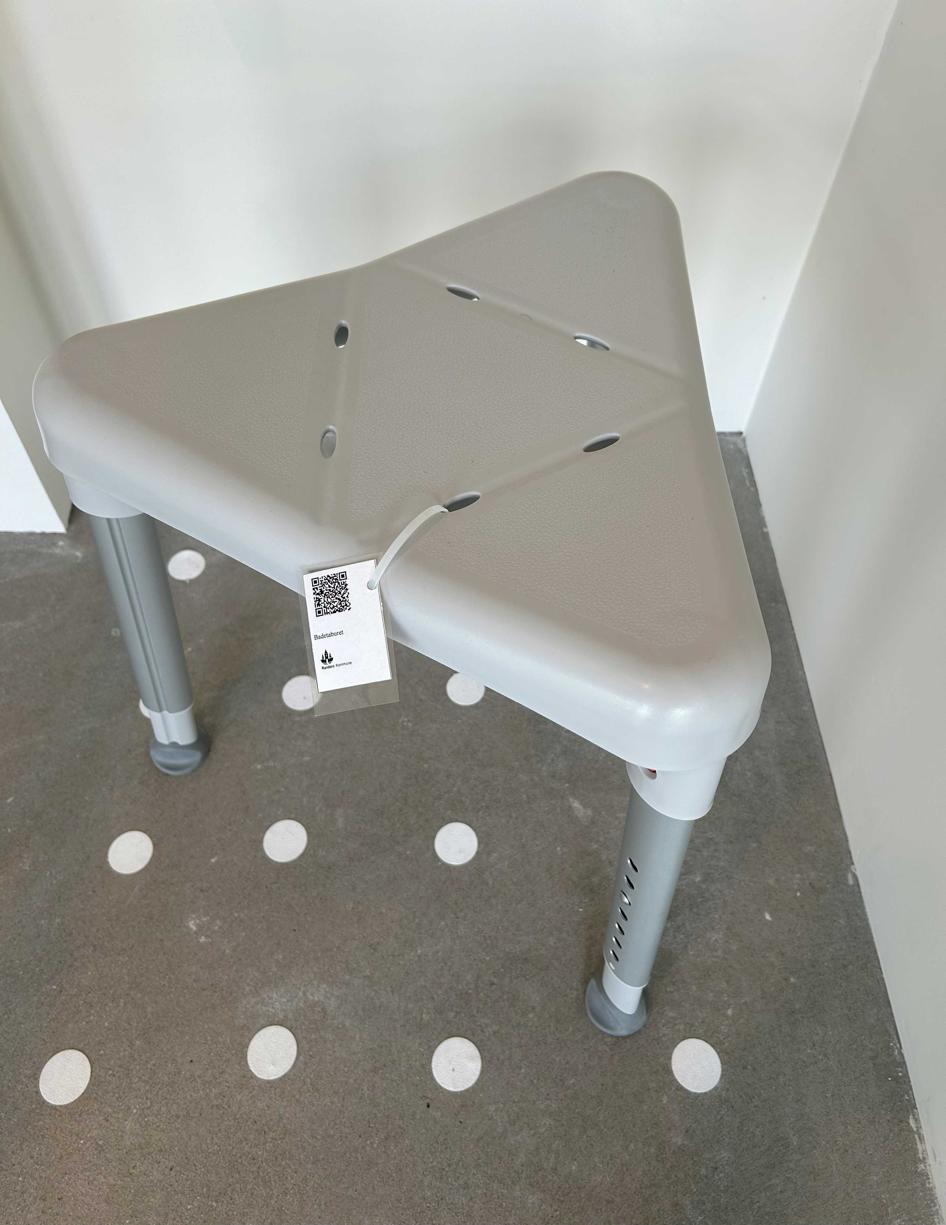 Denne badetaburet optager minimalt med plads i brusekabinen på grund af dens trekantet udformning. Badetaburetten er højderegulerbar og kan stables, hvis man har flere
