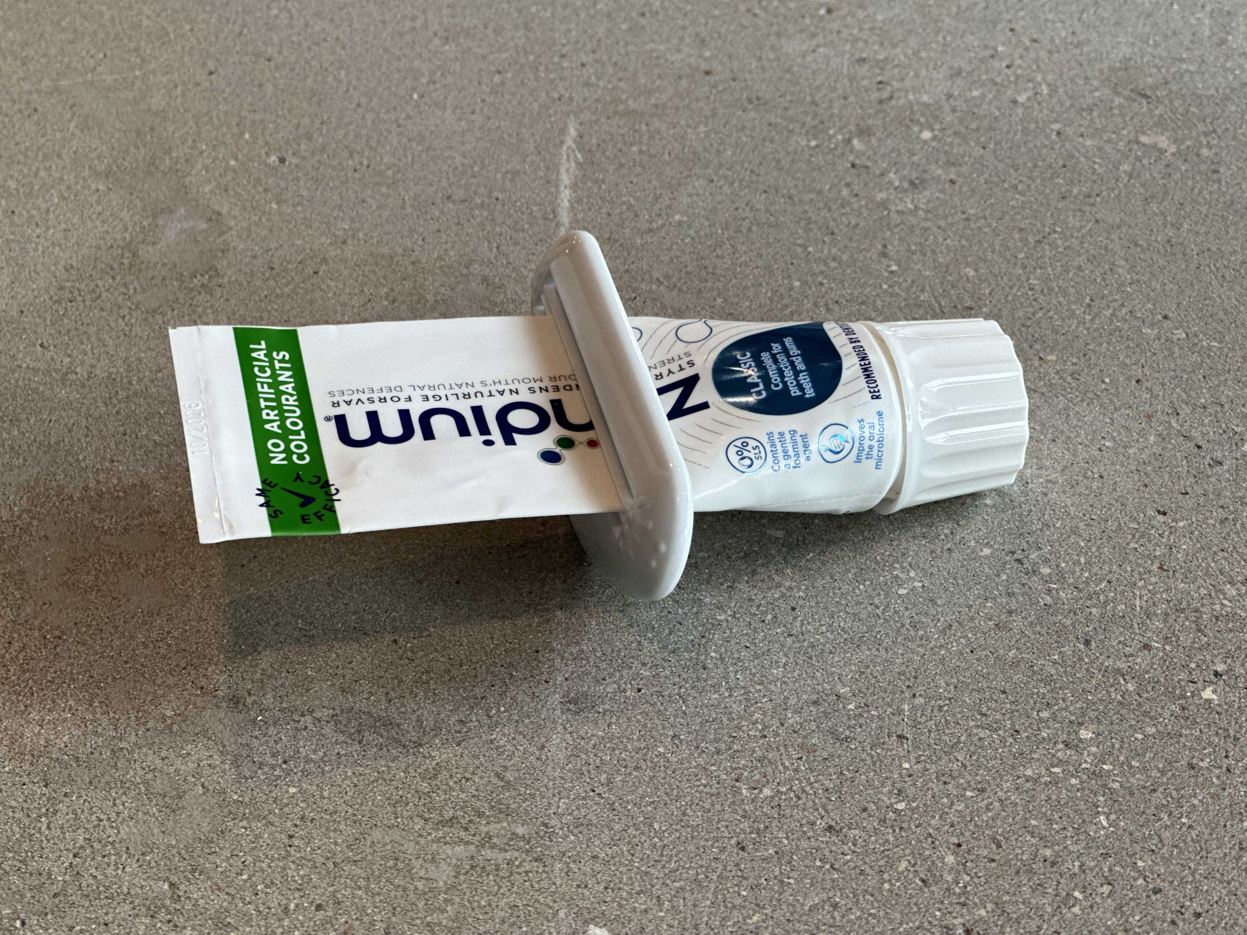 Denne tubeklemmer er en god lille hjælper, der effektivt presser den sidste tandpasta og cremer ud af tuben.