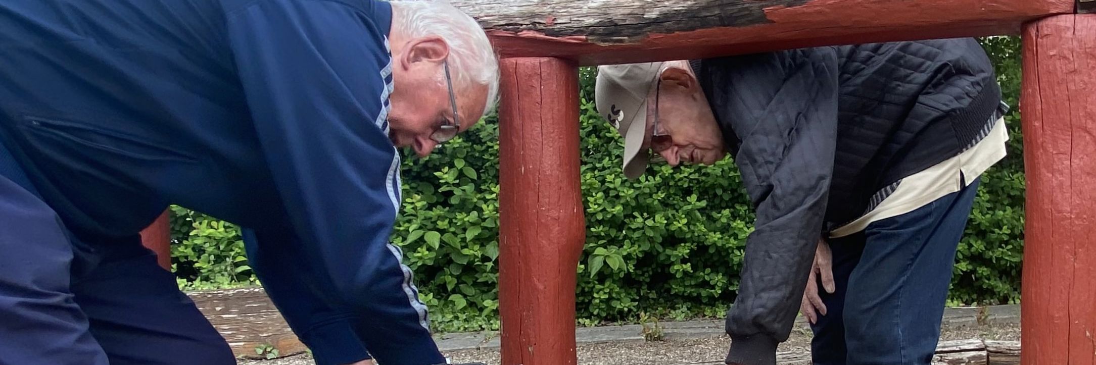 For øjeblikket renoverer de ved fælles hjælp broen i Rosenvængets sansehave. ”Der er meget god træning i sådan et projekt”, forklarer social- og sundhedsassistent Gitte Albrechtsen og træningsmedarbejder Frank Lindgaard, ”- både kognitivt med planlægning, opmåling og udregning, fysisk med håndtering af brædder, værktøj og forskellige arbejdsstillinger samt en masse socialt i samarbejdet”. De fire mænd i gruppen har selv haft en stor andel i at lede og fordele arbejdet mellem sig. Én har dårligt syn men kan godt stå for transporten af brædderne fra ”savværket” (et havebord i en pavillon) og ned til sansehaven. Brædderne balanceres på rollatoren. En anden er god til at udregne og opmåle, og de hjælpes med at få savet, skruet osv.
