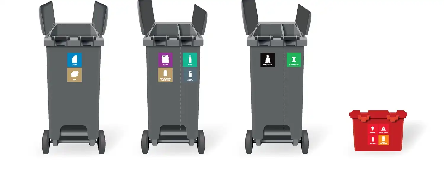 Den mest almindelige løsning består af 3 stk. 240L-beholdere. En med skillevæg til plast/mad- og drikkekartoner og glas/metal. En uden skillevæg til papir og pap, og en med skillevæg til rest- og madaffald.