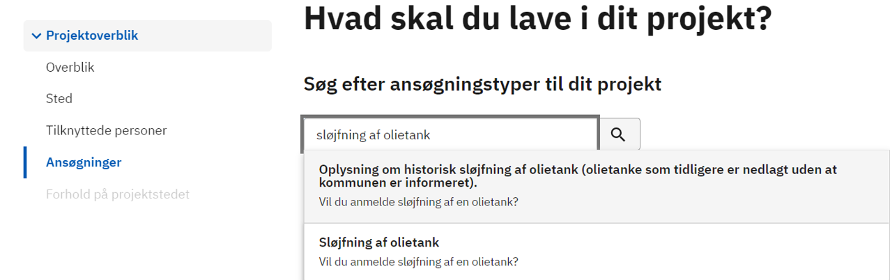 Vælg 'Sløjfning af olietanke' eller 'historisk sløjfning af olietank', hvis olietanken tidligere er nedlagt uden at kommunen er informeret.