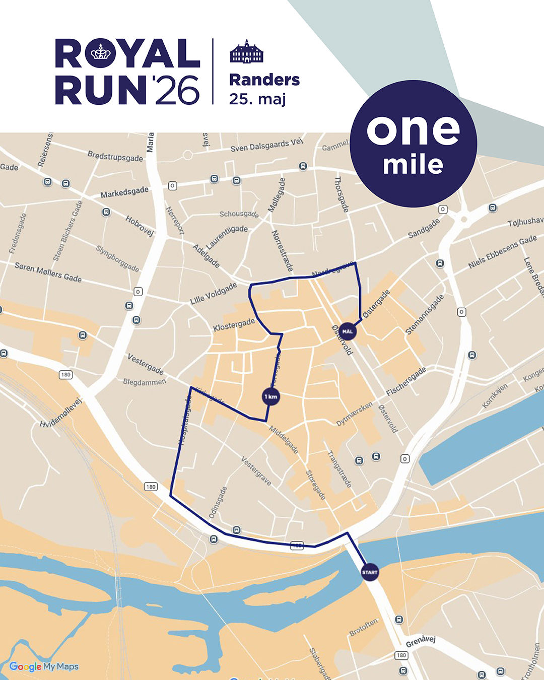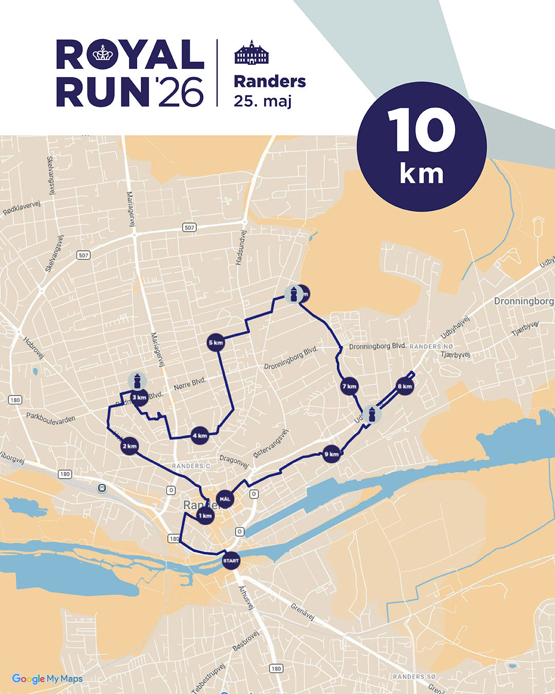 Alle tre ruter ved Royal Run i Randers har start på Randersbro med udsigt til Gudenåen og Randers Havn. Målstregen er placeret ved Den Jyske Hingst på Østervold