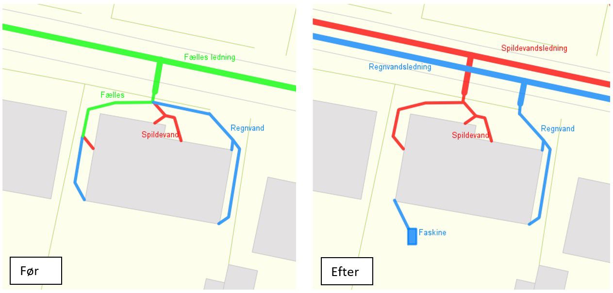 Oftest kan din gamle fællesledning på din grund benyttes som spildevandsledning fremover. Dette kan minimere arbejdet. Efterfølgende skal der kun etableres en ny regnvandsledning på din grund. Derudover kan du evt. nedsive regnvand fra dele af dit tagareal. Omkostningerne er dog generelt meget forskellige fra ejendom til ejendom.