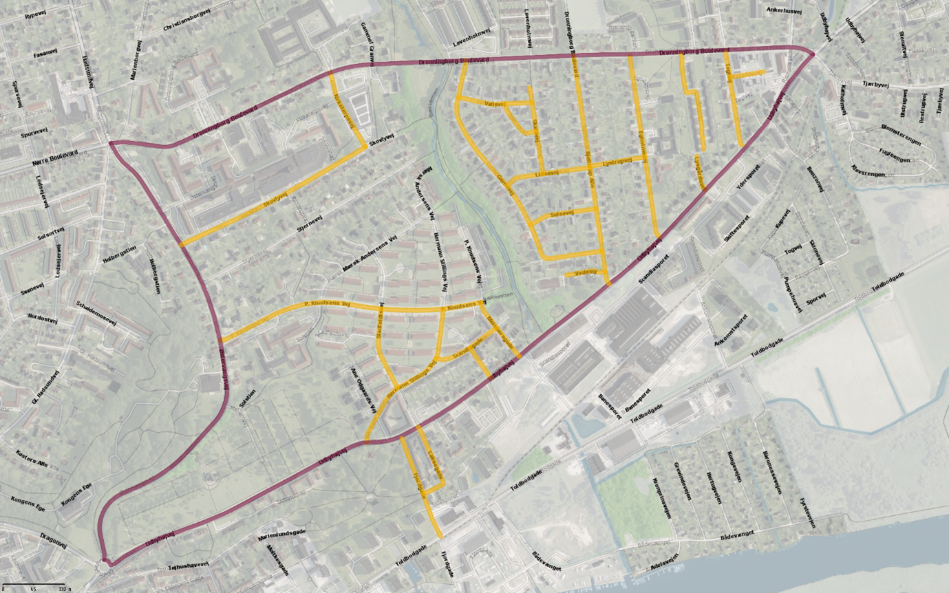 Undersøgelsesområdet set fra oven. De gule streger viser de veje der er inviteret til undersøgelsen (Baggrundskort: Kortforsyningen).