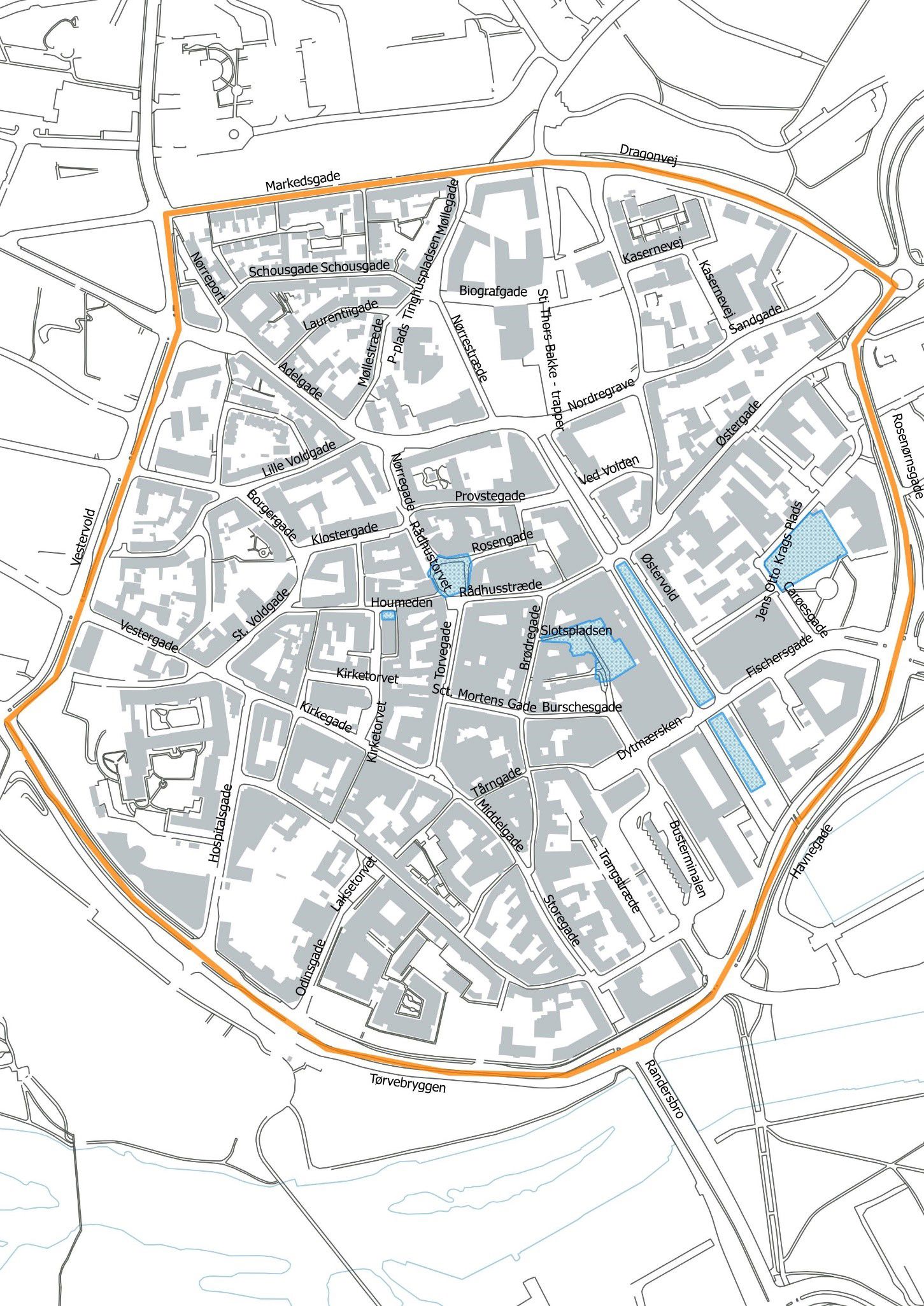 Randers Midtby består af den gamle bykerne inden for centerringen, afgrænset af Tørvebryggen, Vestervold, Markedsgade, Dragonvej, Rosenørnsgade og Havnegade. Gågader er markeret med grønt.