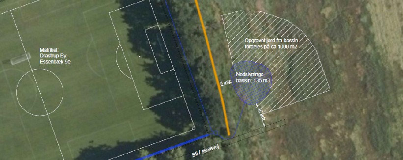 Billedet viser nedsivningsbassinet og terrænreguleringens placering