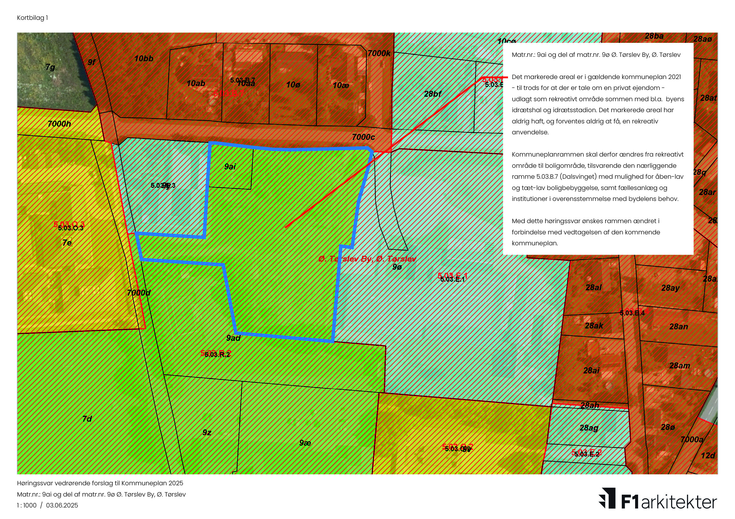På vegne af grundejeren, Daugaard Sørensen Handel, skal jeg hermed anmode om, at rammen for ovennævnte ejendom i forbindelse med kommuneplan 2025 ændres til at muliggøre tæt/lav bebyggelse i form af enten ni boligenheder fordelt på tre parcelhuse samt tre dobbelthuse eller alternativt 8 parcelhuse.