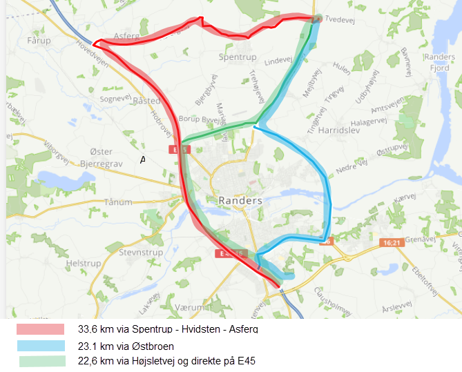 Fra f.eks. Hald til Sdr. Borup afkørslen er der 18 km, hvis nogen har tid til turen over Randers bro. Via Højsletvej og direkte af ny vej til E45, er der knap 23 km – lidt længere, men naturligvis meget hurtigere. Kører man over Spentrup, Hvidsten og Asferg, er der hele 34 km til Sdr. Borup afkørslen. Og med en Østbro ville turen blive på godt 23 km dvs. en smule længere end turen via Højsletvej. Se vedhæftede skitser.