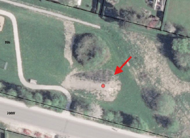 Luftfoto af jordhøj/kælkebakke (angivet med rød pil)