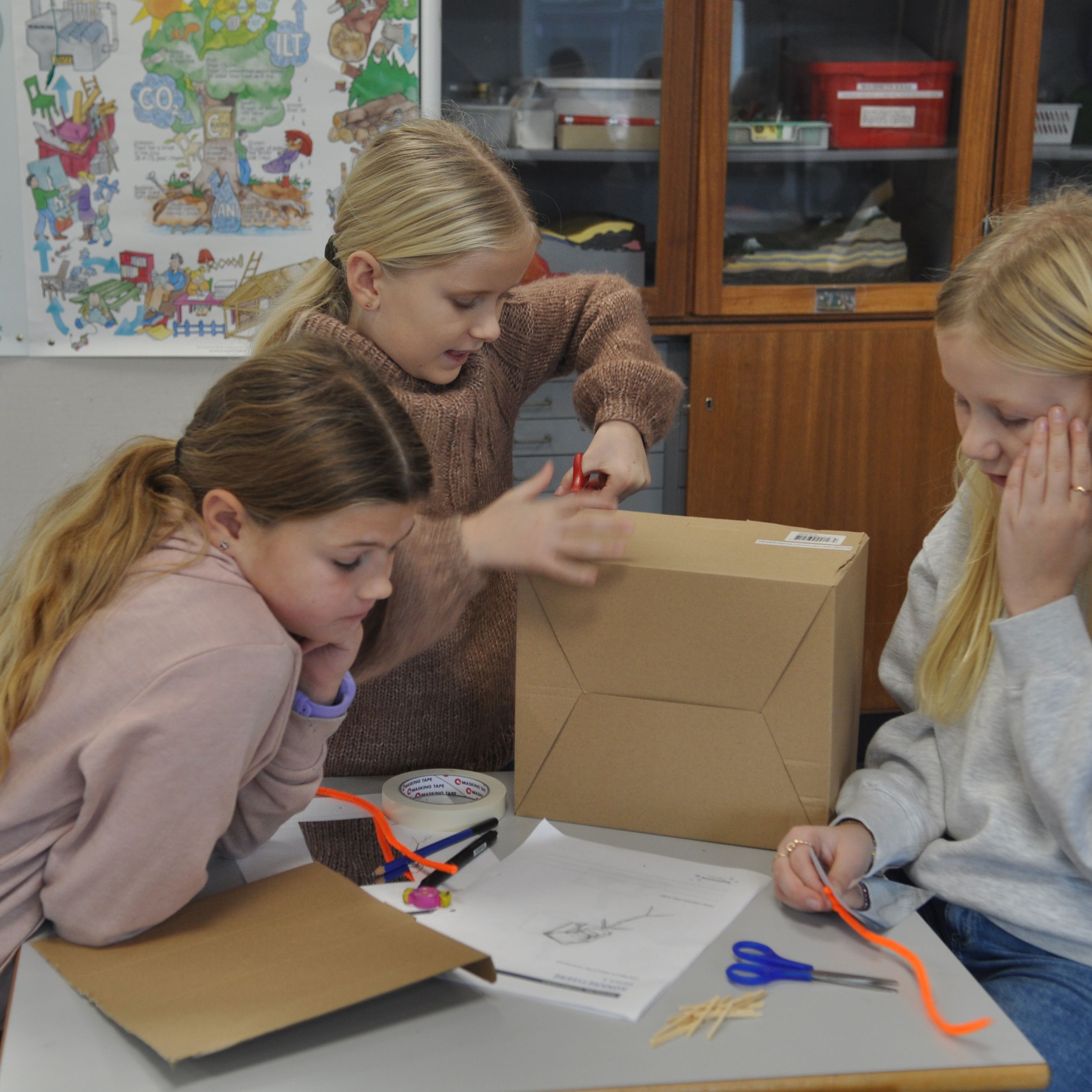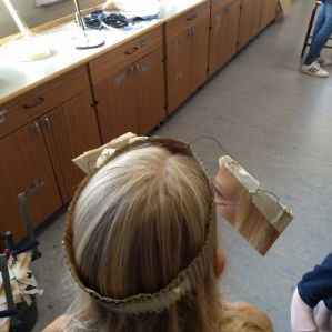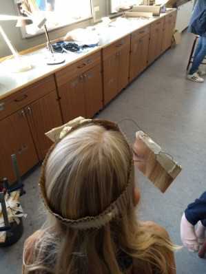"Det går ikke piger. Vi skal kunne se bagud. Vi bliver nødt til at lave det som et pandebånd i stedet," siger Thilde. Julie løber hurtigt efter bølgepap. For i en designproces, har Hanne Schøler Fast lært dem, at det ikke altid er den første idé som virker, og så må man lave om og tilpasse.