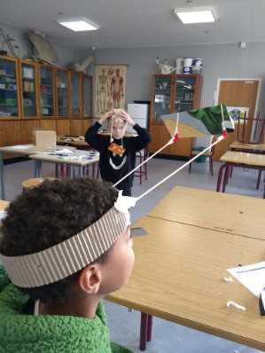 De var derfor klædt godt på til at gå i gang med den egentlige udfordring: at lave en prototype, hvor det er muligt at kunne se i flere retninger samme tid. Dagen startede i grupper med undersøgelser af synsfeltet ved at bruge hænder, arme og spejle. Efterfølgende skulle grupperne brainstorme på ideer og tegne den endelige prototype på papir.