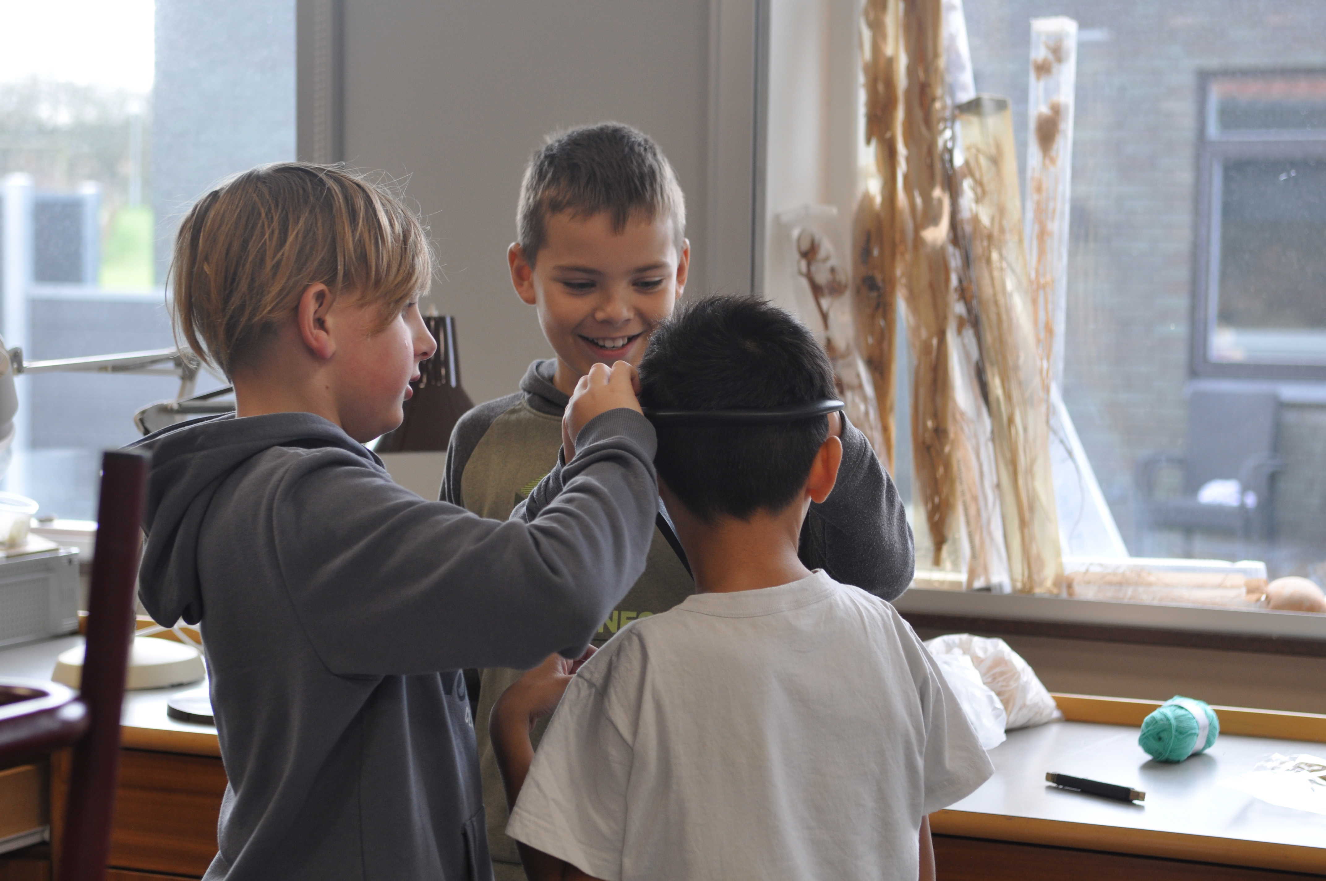 Flere af klasserne på skolen var indbudt til at se præsentationerne af de mange fine prototyper. Her demonstrerede en af grupperne hvordan deres prototype virkede, ved at den ene elev tog den på hovedet, mens den anden elev placerede sig bagved og holdt et par fingre op. Herefter kunne eleven med prototypen, så fortælle hvor mange fingre han kunne se.