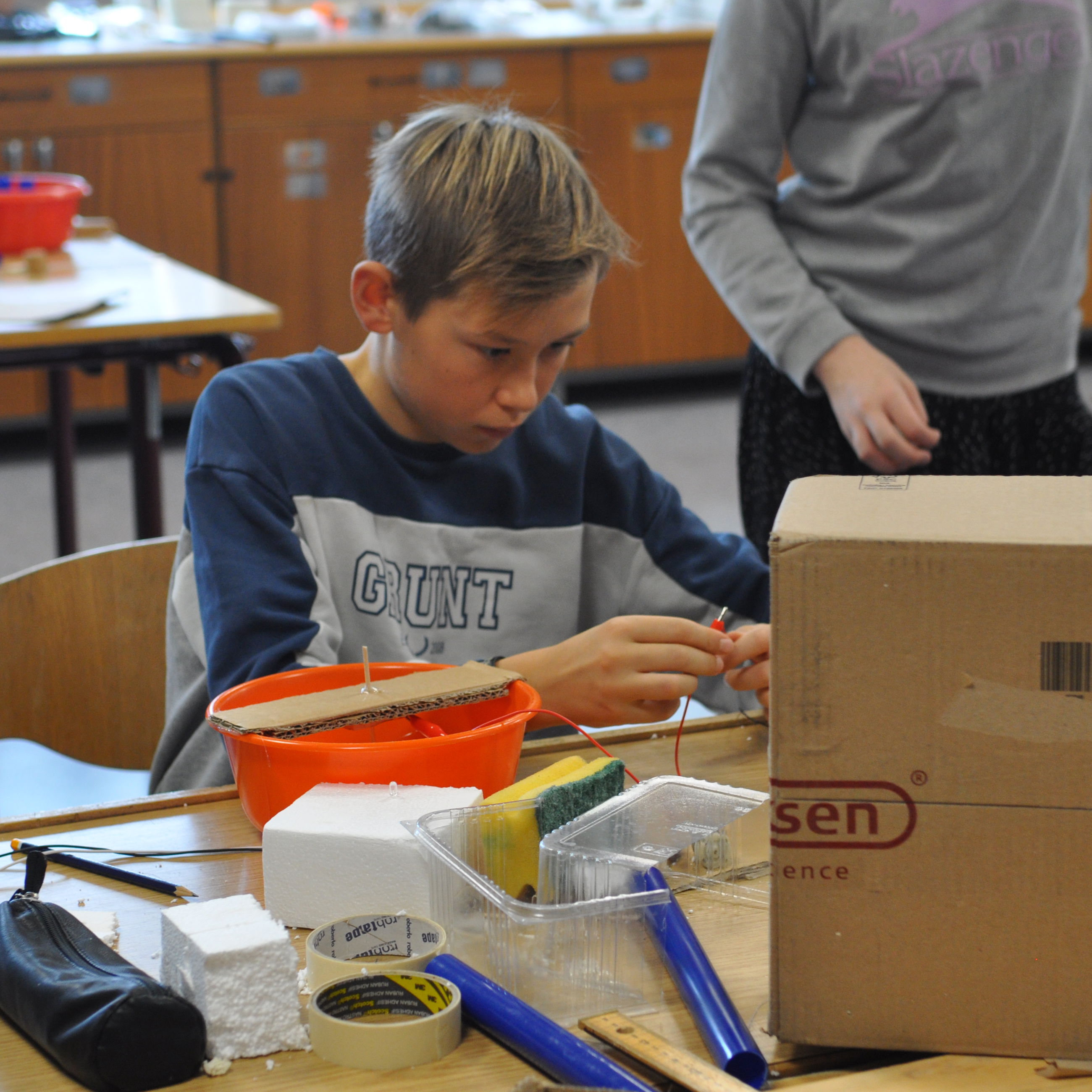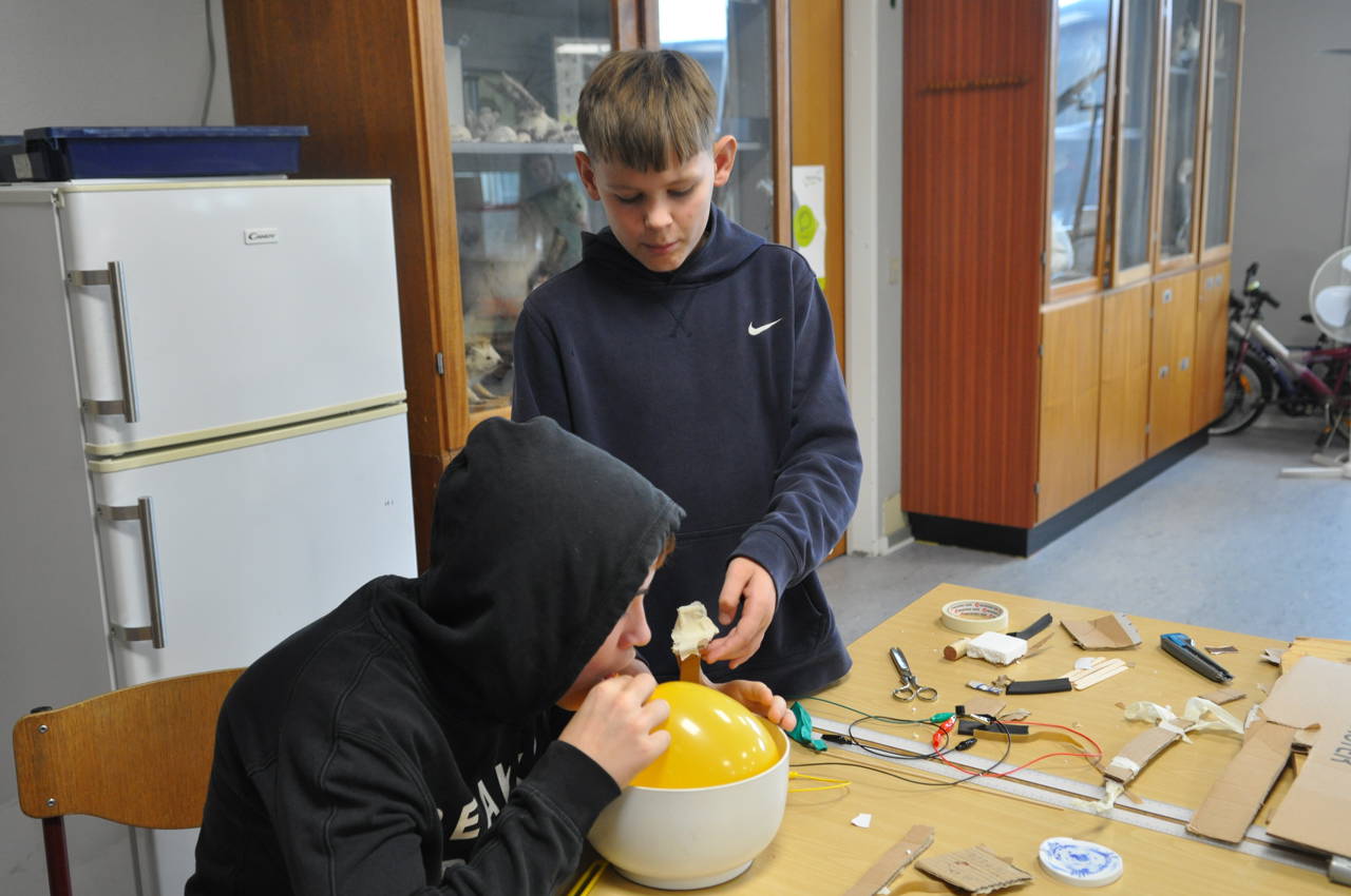 Mens eleverne på mellemtrinnet bygger alarmsystemer, arbejder de yngste elever i indskolingen med spejle, konstruerer en slags brille, så de kan se bagud og fremad på samme tid. 7. – 10. klasserne i udskolingen udvikler et exoskelet, der kan styrke håndens bevægelser.