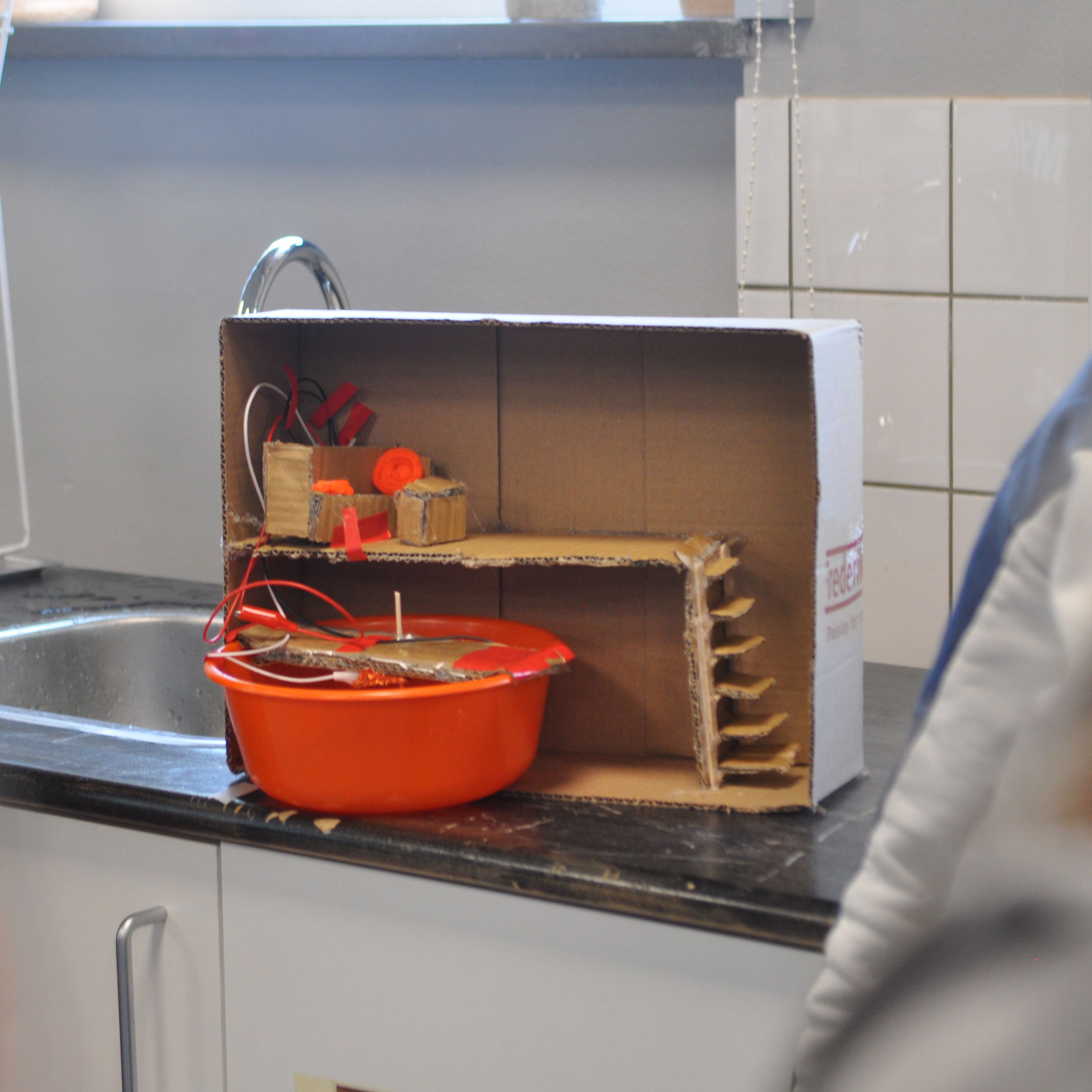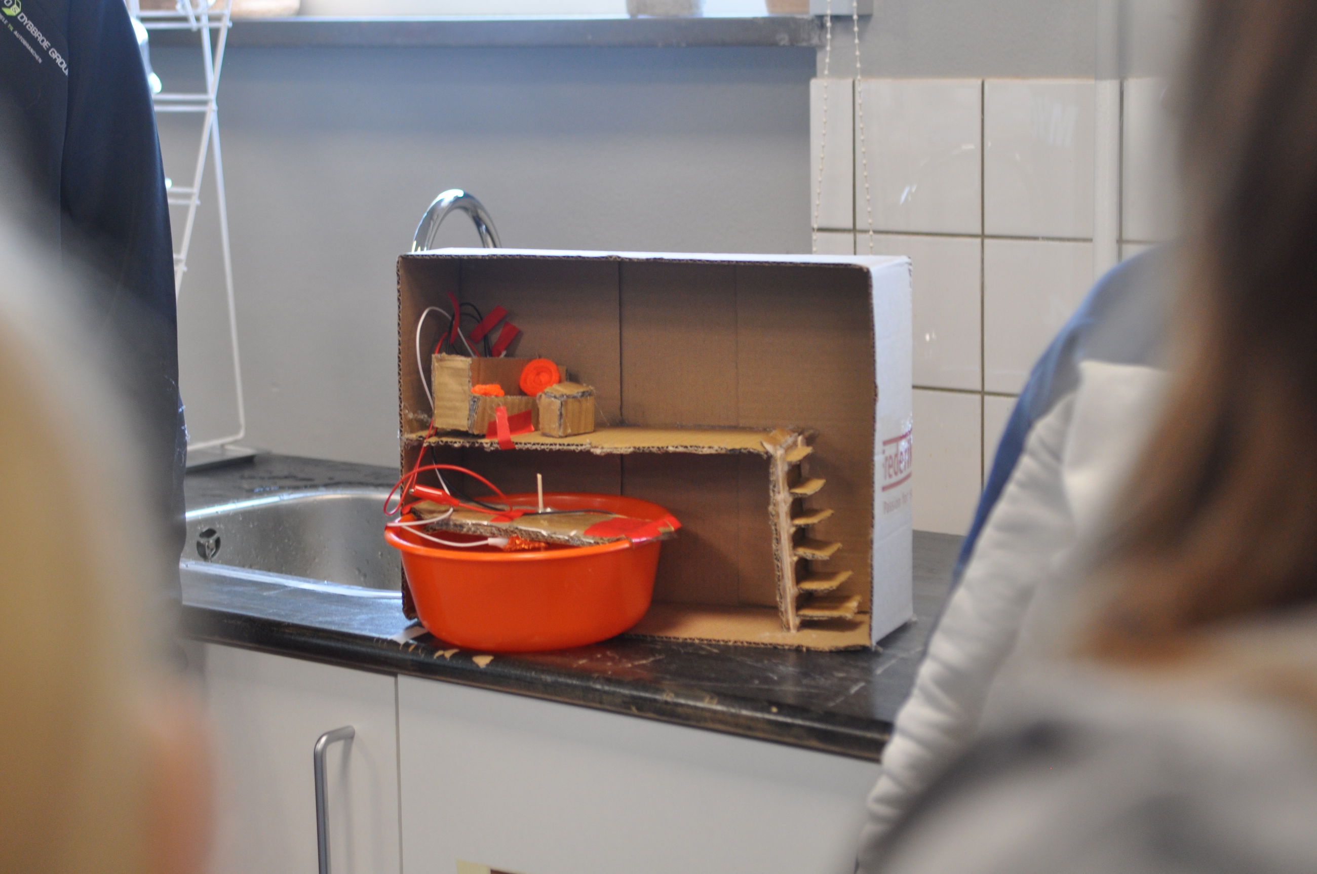 Hos Jacob, Kayla og Vilma havde de fundet inspiration fra et skib. For kommer der vand ind i bunden af skibet, vil kaptajnen oppe på dækket få besked via en alarm. "Jeg har set en video med et skib, hvor kaptajnen bliver alarmeret på den måde. Det har vi så overført til et hus, hvor der udløses en alarm på øverste etage, hvis vandet stiger i kælderen," fortæller Jacob. Gruppens prototype bestod af et hus med etager bygget ud af en papkasse, og med en balje med vand i bunden af huset. Målet var at få et lille stykke flamingo til at flyde op og ramme en kontakt, så alarmen gik i gang.
