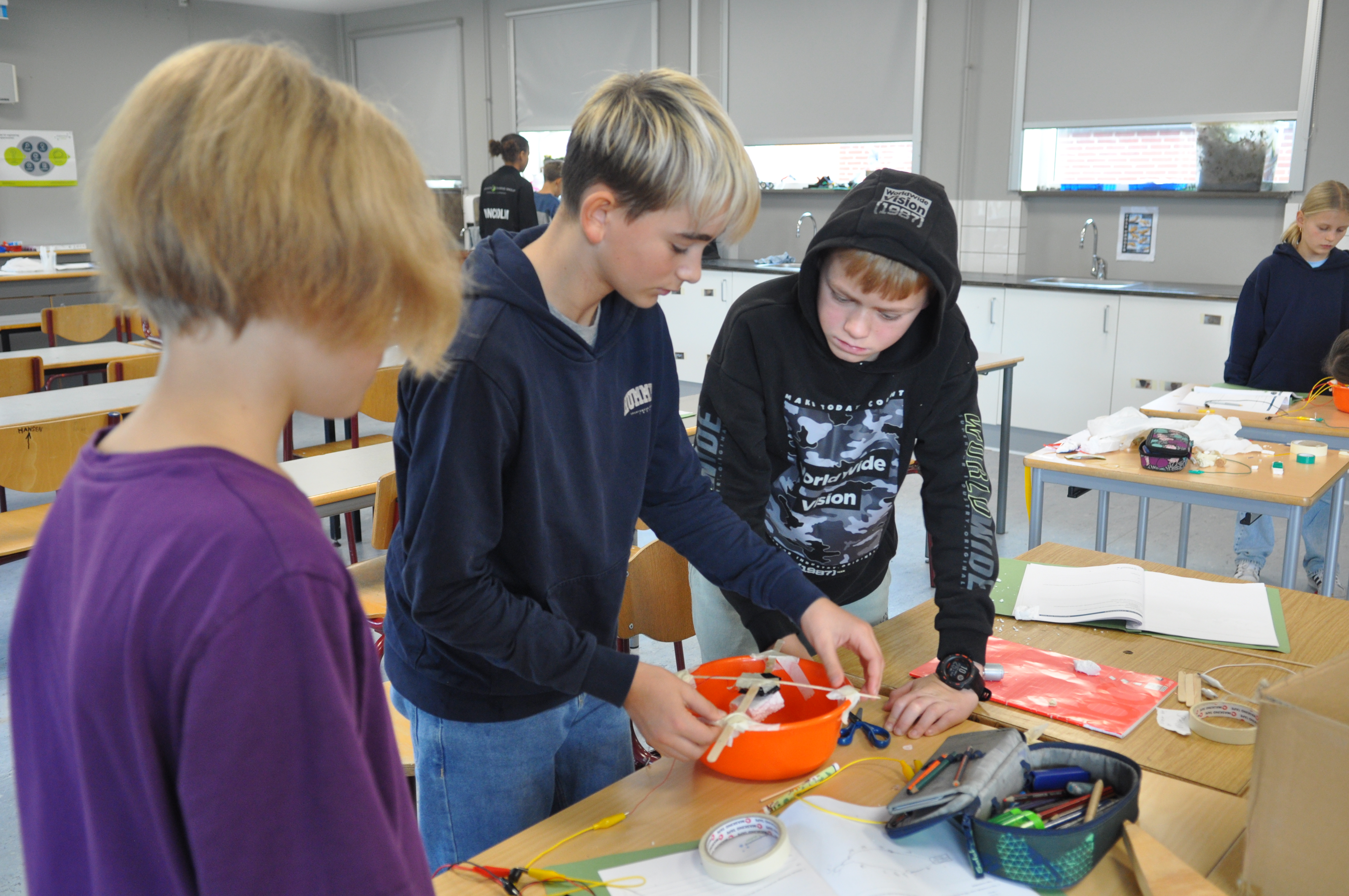 Mens eleverne på mellemtrinnet bygger alarmsystemer, arbejder de yngste elever i indskolingen med spejle, konstruerer en slags brille, så de kan se bagud og fremad på samme tid. 7. – 10. klasserne i udskolingen udvikler et exoskelet, der kan styrke håndens bevægelser.