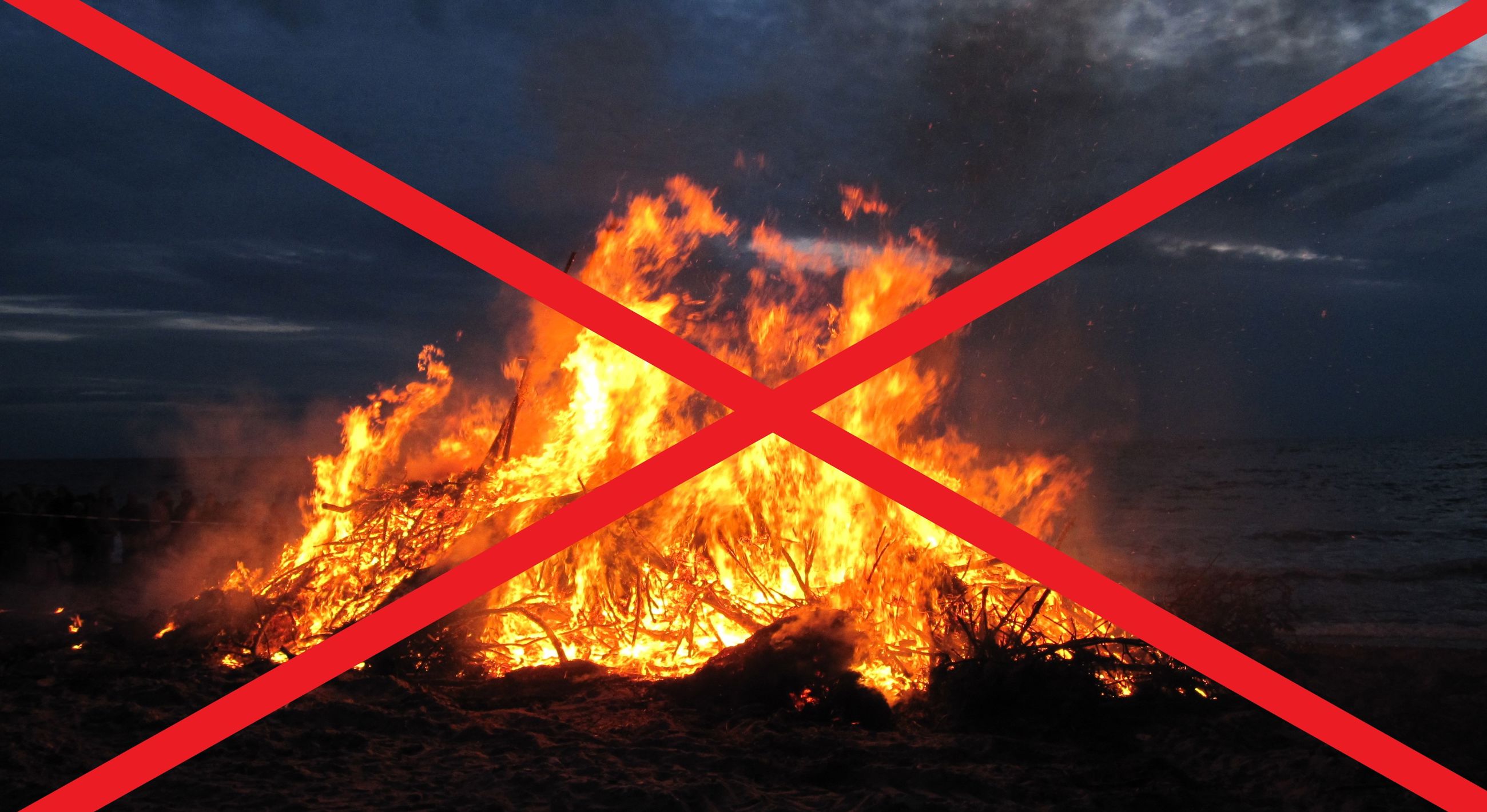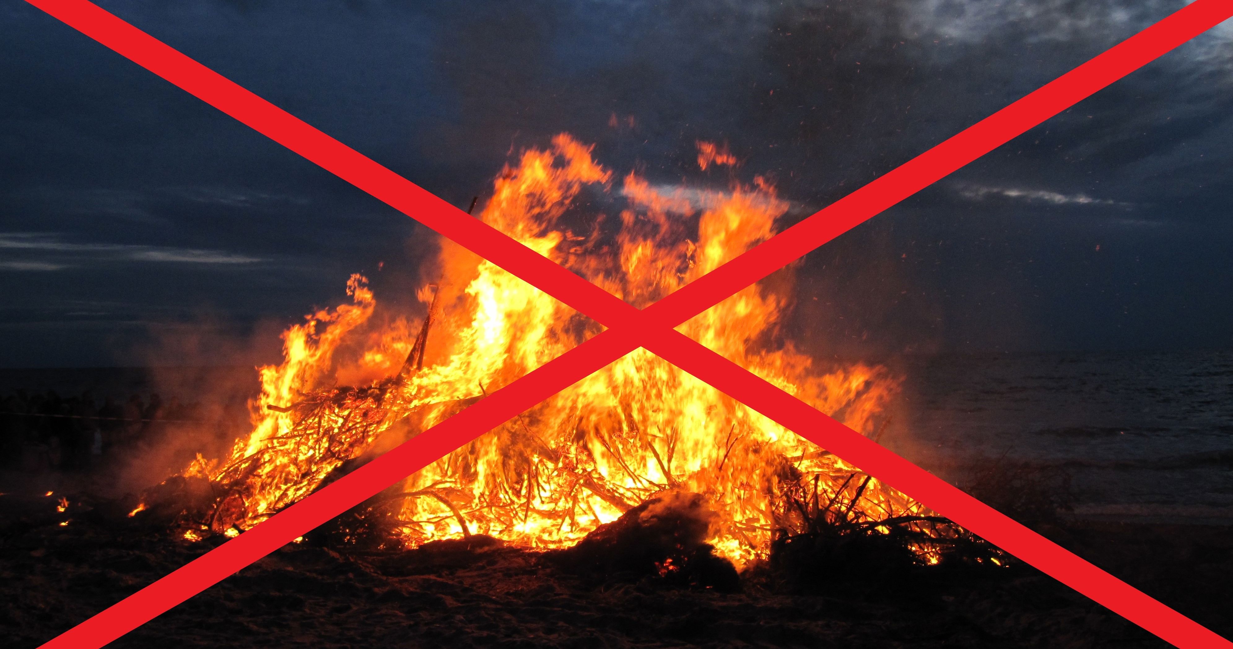 Det betyder: Enhver form for afbrænding af bål (uanset om det er med kul, træ, briketter eller andet brændsel), herunder også afbrænding i bål fad, samt Skt. Hans-bål, afbrænding af haveaffald, skovaffald, øvrigt affald, halm, siv og lign., og al udendørs brug af ovne, ildsteder, fakler, haveblus, stearinlys og lign., inkl. på og ved søer, og på kystnært hav (mindre end 200 meter fra land), er ikke tilladt.