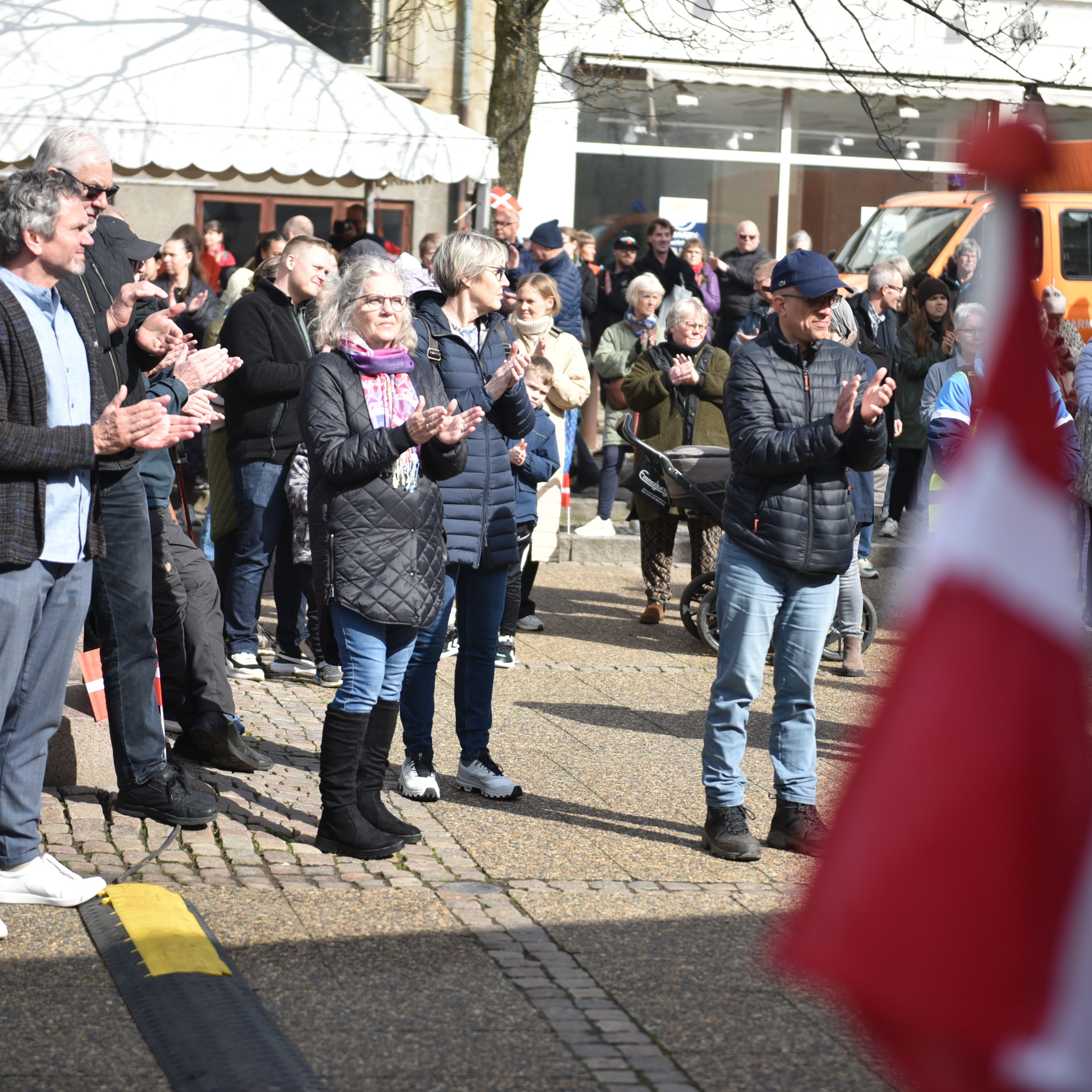 "Vi er blevet 100.000 borgere, og det forstår man jo godt, når man står et sted som her i Assentoft. Her bliver sat mange gode ting i gang og gjort en stor indsats for f.eks. at udvikle aktiviteterne i byen. Og så kommer vi heller ikke udenom, at Assentoft ligger flot i landskabet. I ved, beliggenhed, beliggenhed, beliggenhed. Tak til jer, der i dag er mødt op for at fejre, at vi i fællesskab har fået flere borgere i kommunen. Og tak til Essenbæk Håndværker og Borgerforening, der har gjort den her fejring mulig".