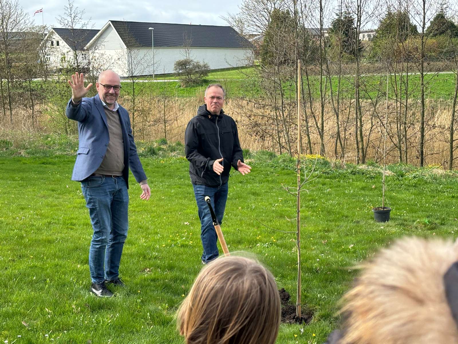 Det første træ blev plantet af Finn Vestergaard fra Aktivitetsparken sammen med datteren.