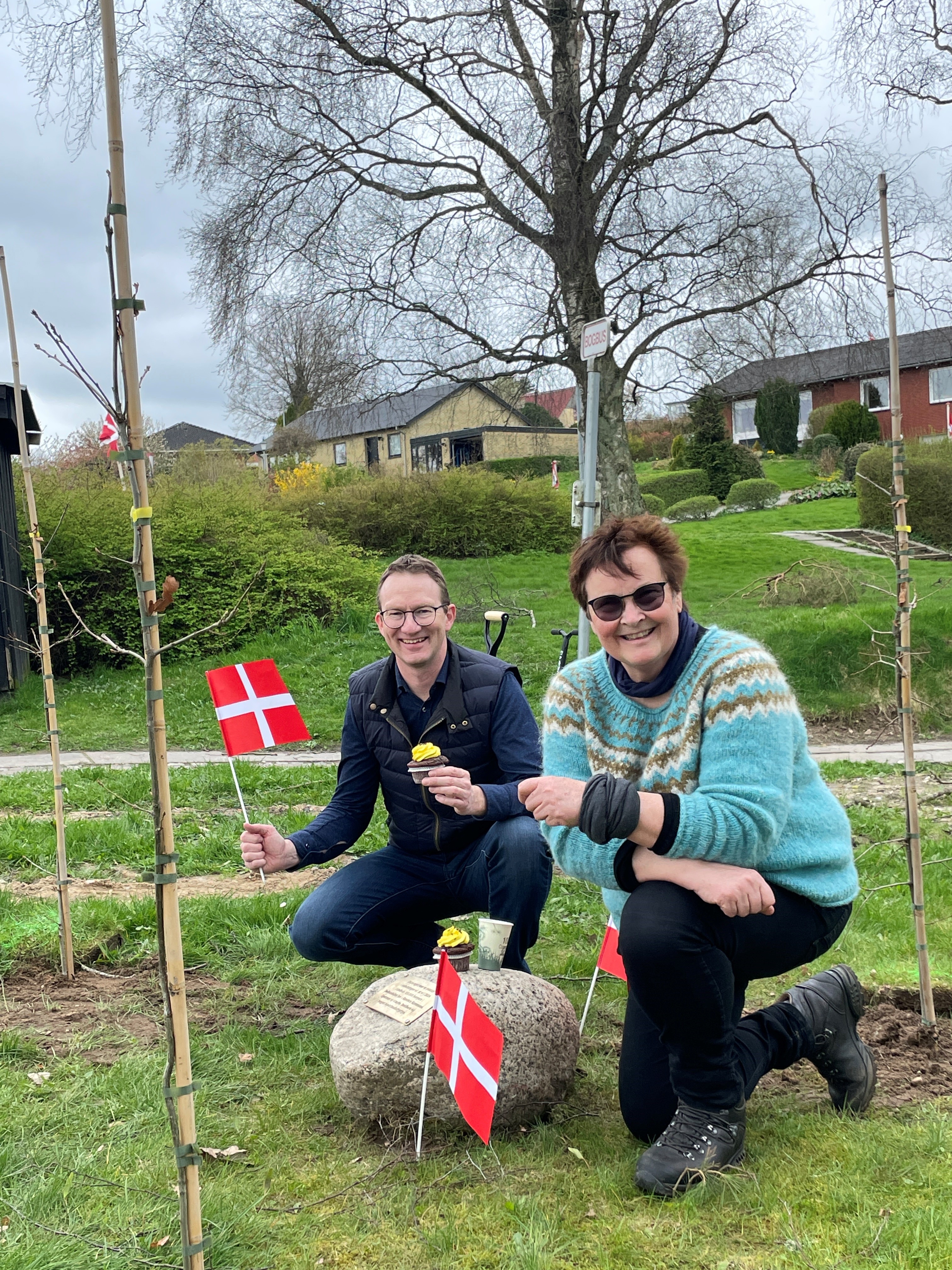 Kirsten Søgård fra Beboerforeningen plantede det andet træ sammen med yngste barnebarnet Ebbe, der går i førskole og tredje og sidste træ blev sat i jorden af Per Tøttrup fra Krolfklubben.