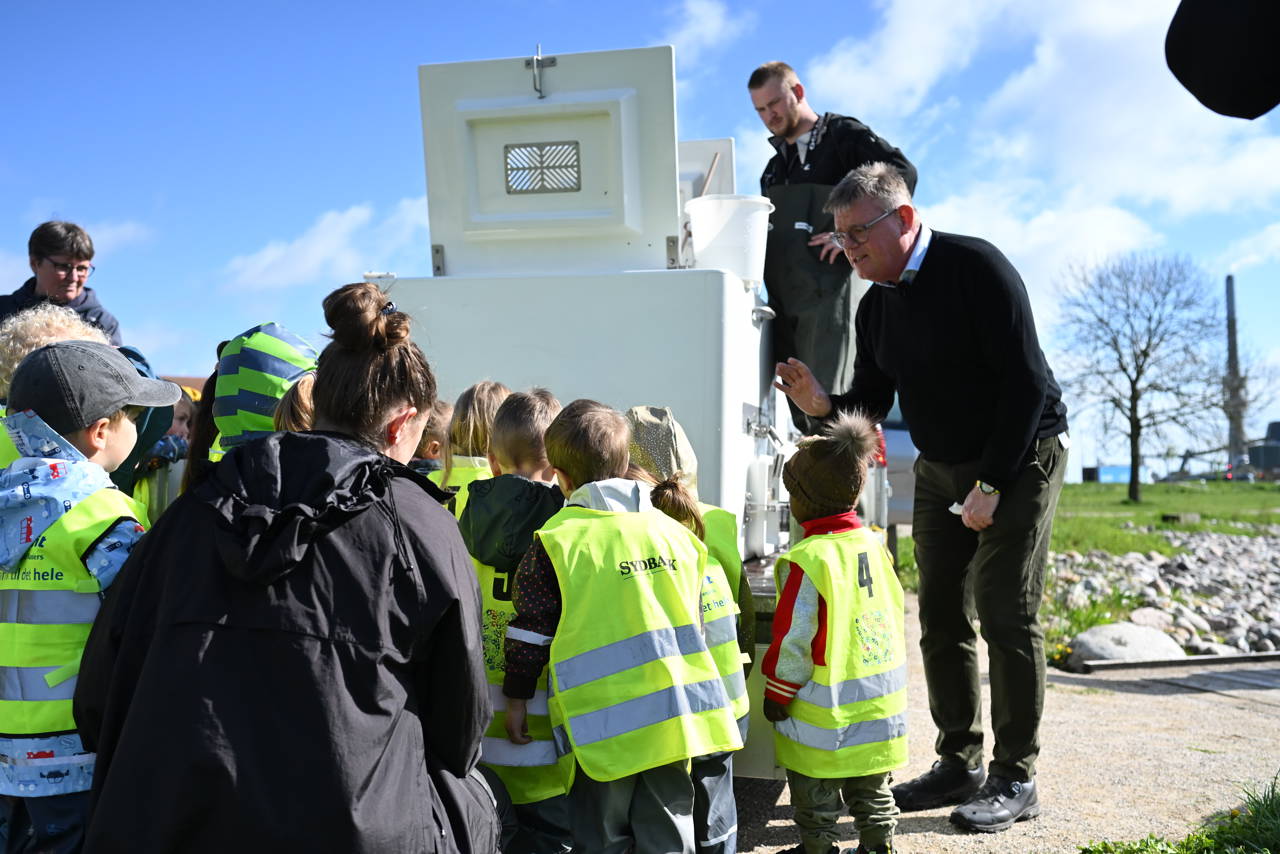 Omkring en vandtank fyldt med små livlige laks, stimlede de meget nysgerrige børn sammen. Her bød borgmester Torben Hansen velkommen, hvor han blandt andet fortalte børnene om, at de nu skulle være med til at sende laksen på rejse mod Nordatlanten, og at den ville vende tilbage til Gudenåen, når den er blevet stor.