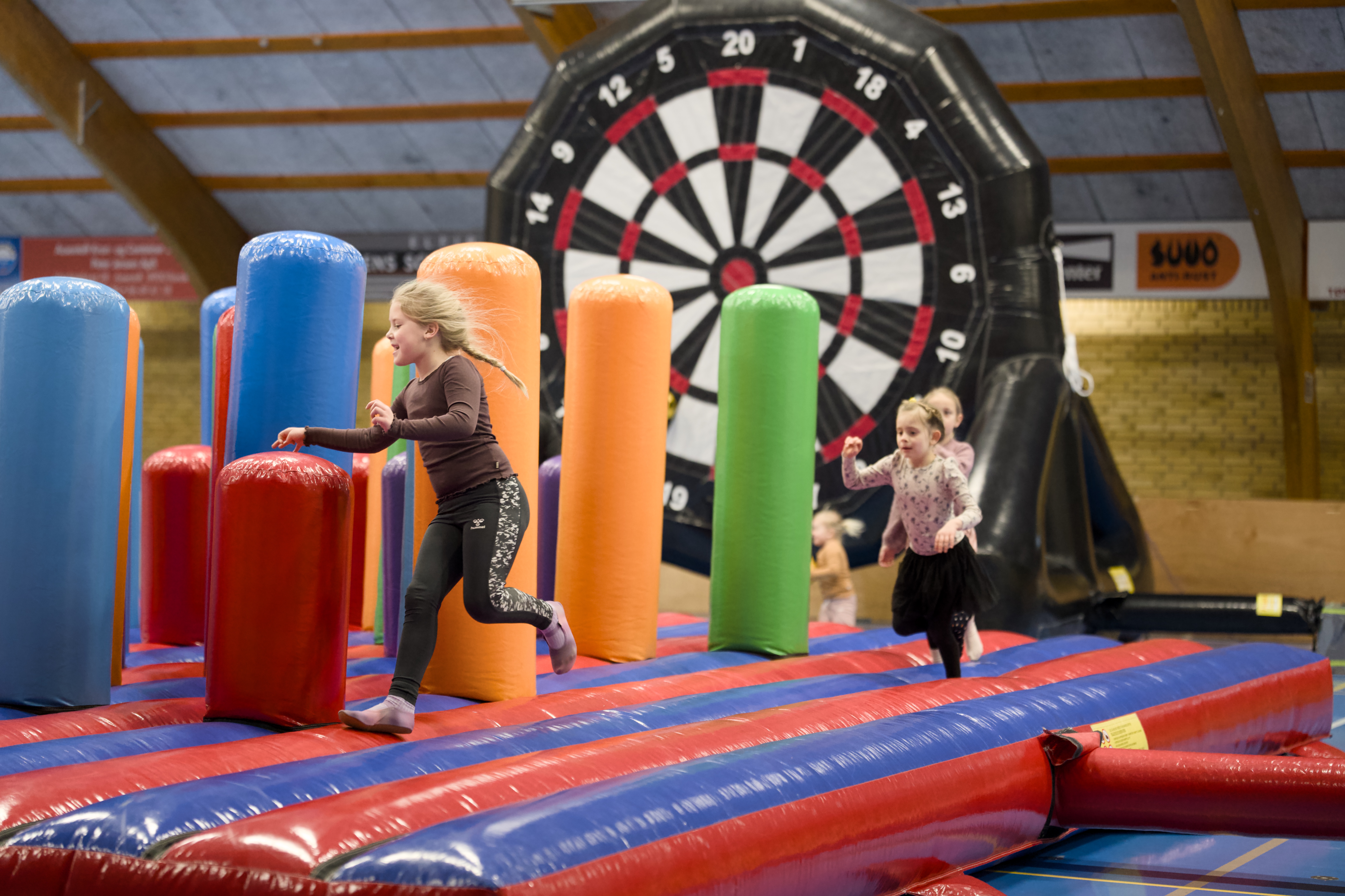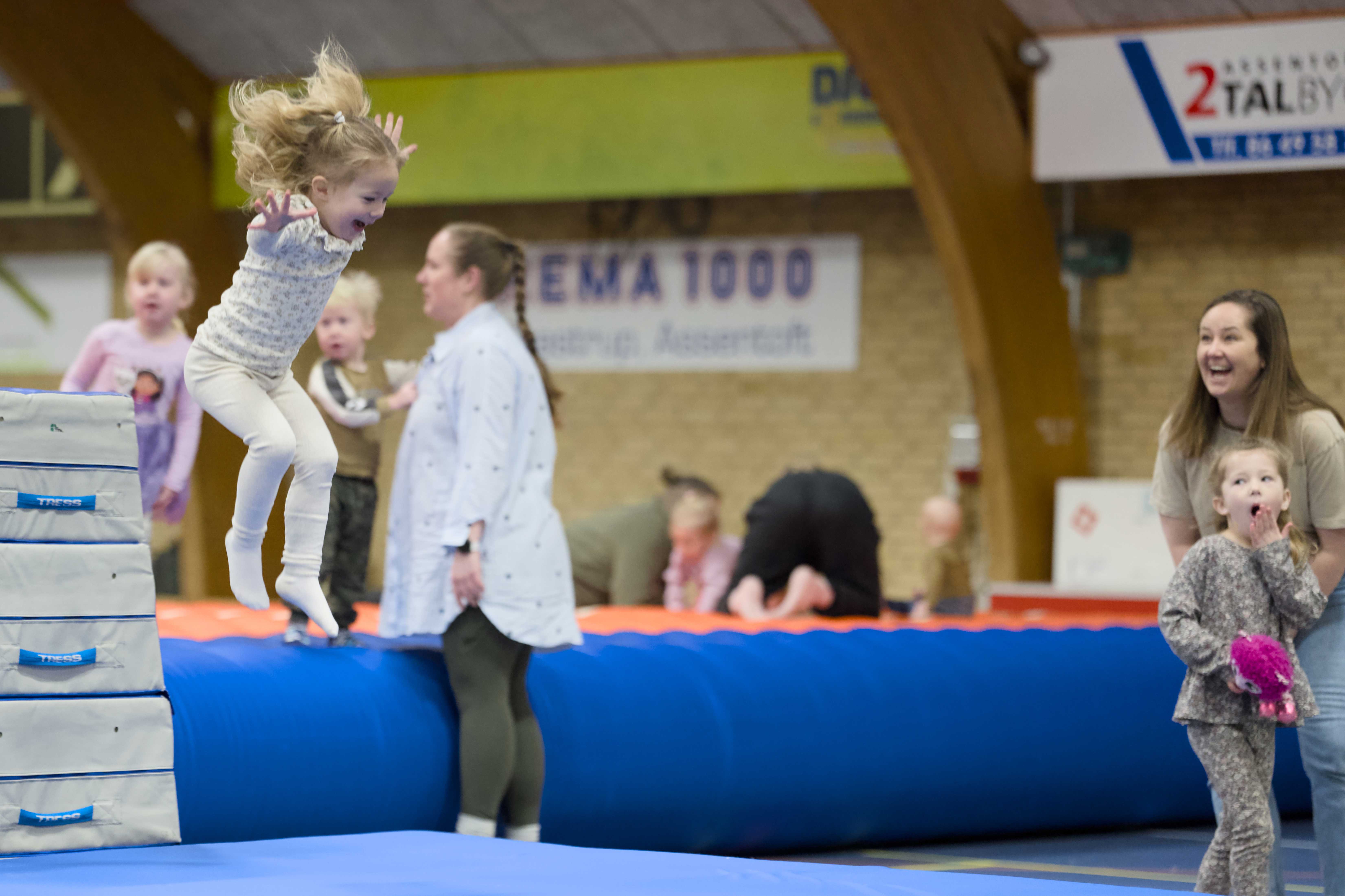 Allerede fra kl. 9 åbnede Flyvende Hal i Assentoft Hallerne, hvor børnene kunne lege frit med redskaber, bolde og bevægelsesaktiviteter i trygge rammer. Her summede hallerne af grin, leg og energi, mens forældre og bedsteforældre enten deltog eller heppede fra sidelinjen.