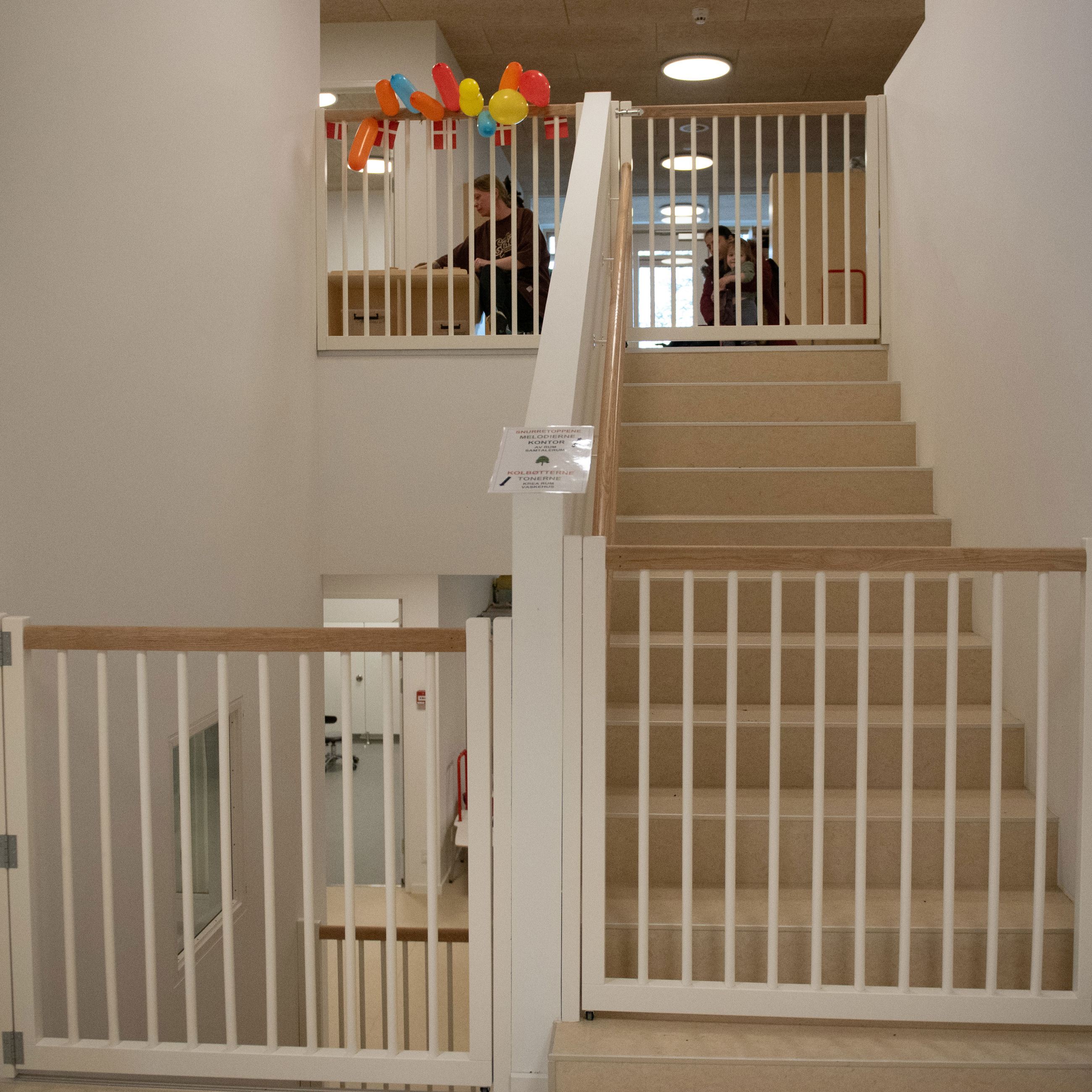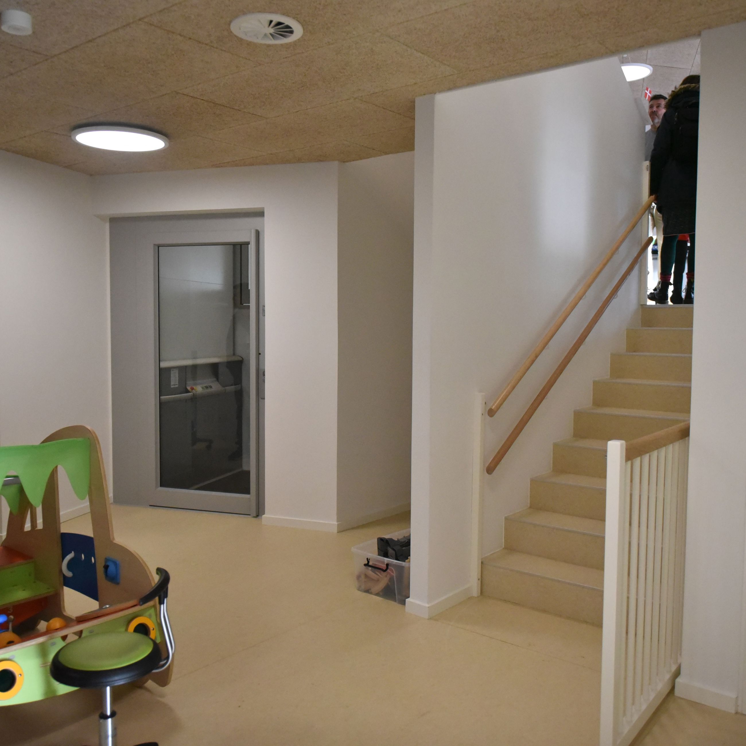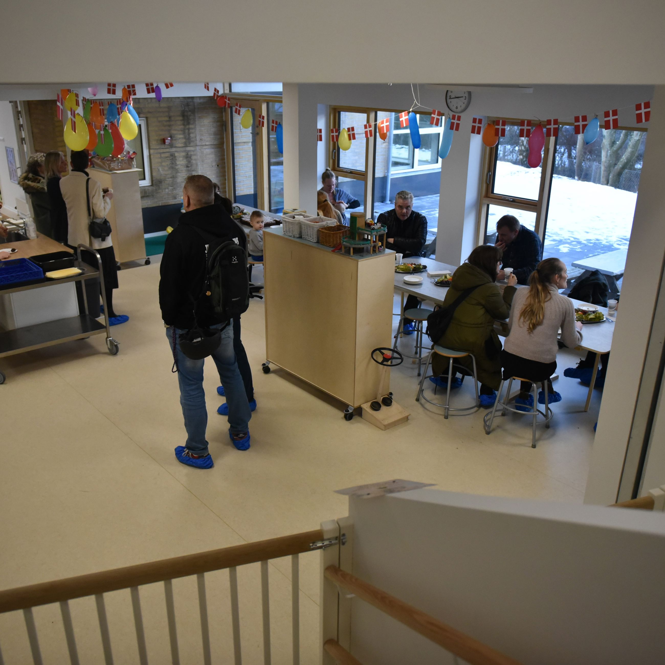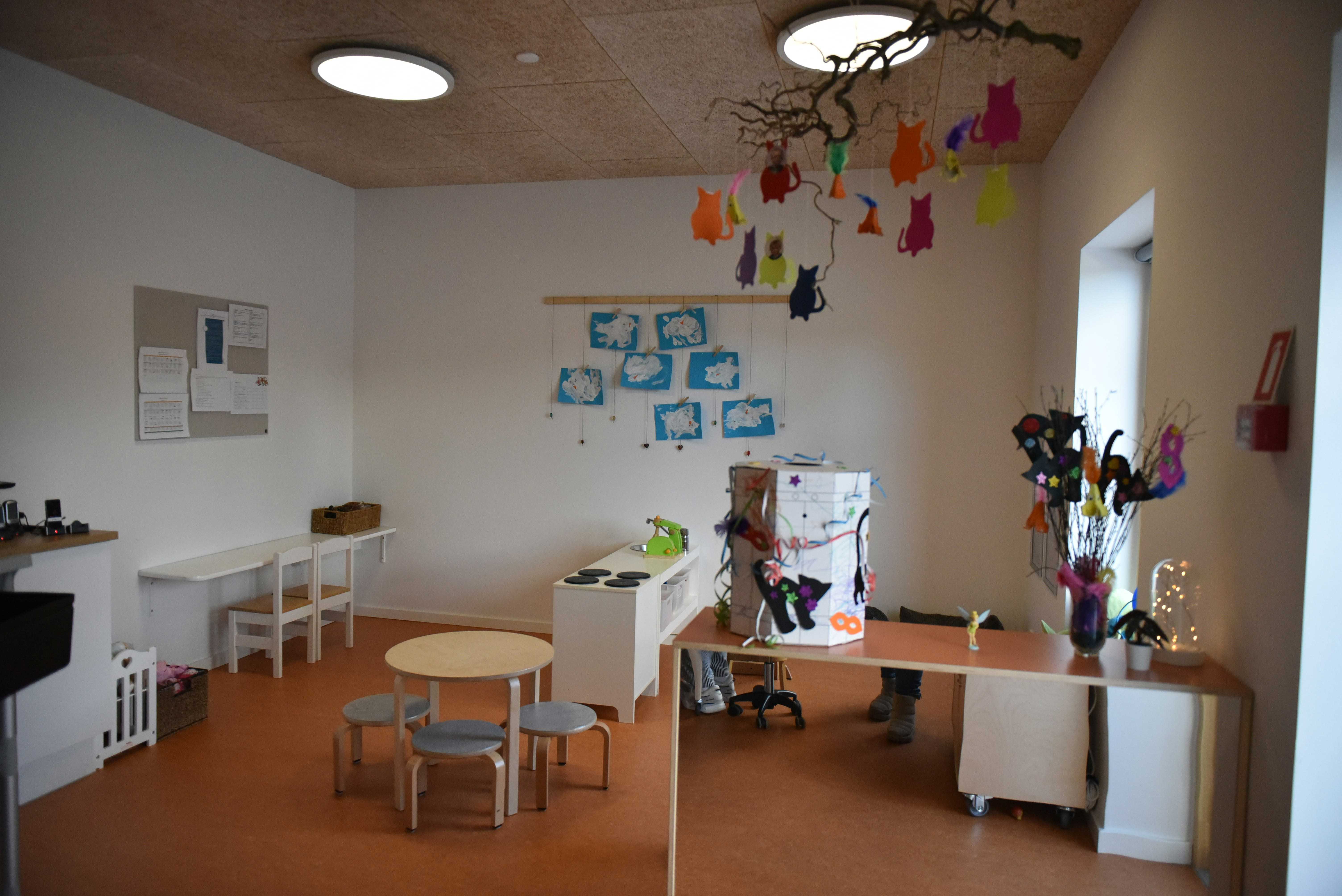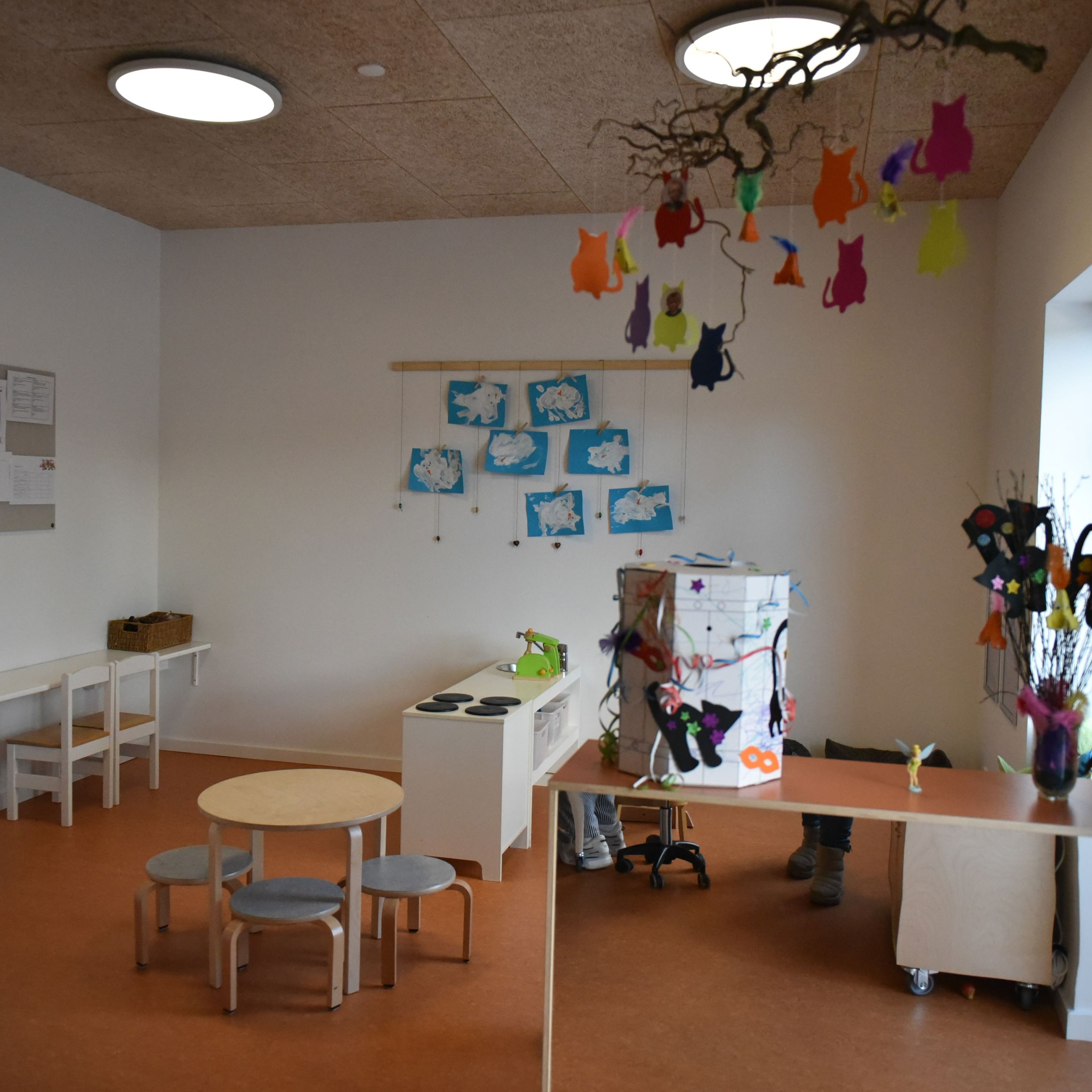 I sammenbygningen mellem den nye tilbygning og den oprindelige bygning er der etableret et cafeteria, der giver et naturligt samlingssted for børnene. I den oprindelige bygning er der lavet et lyst, stort multirum, flere stuer til vuggestue og børnehave, og et personalerum.