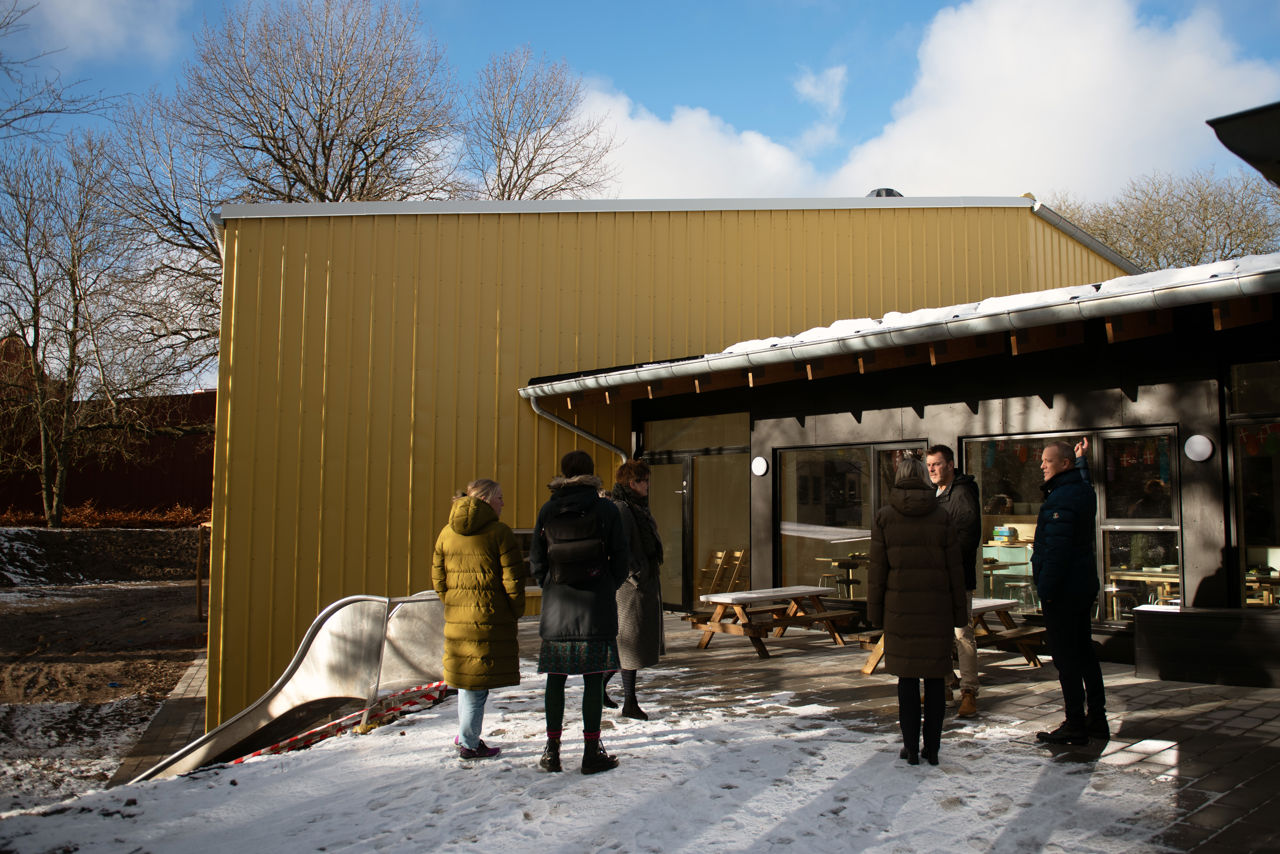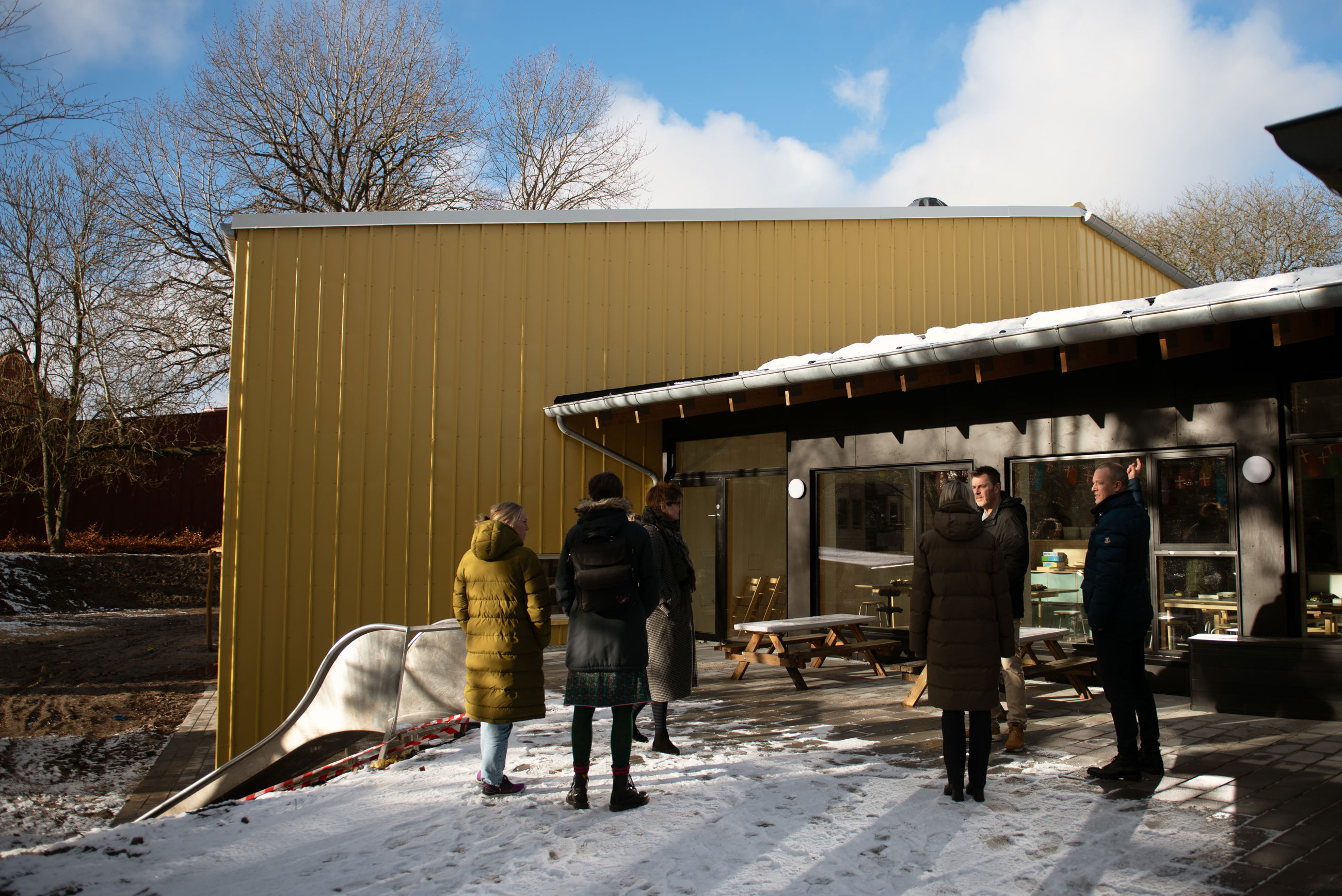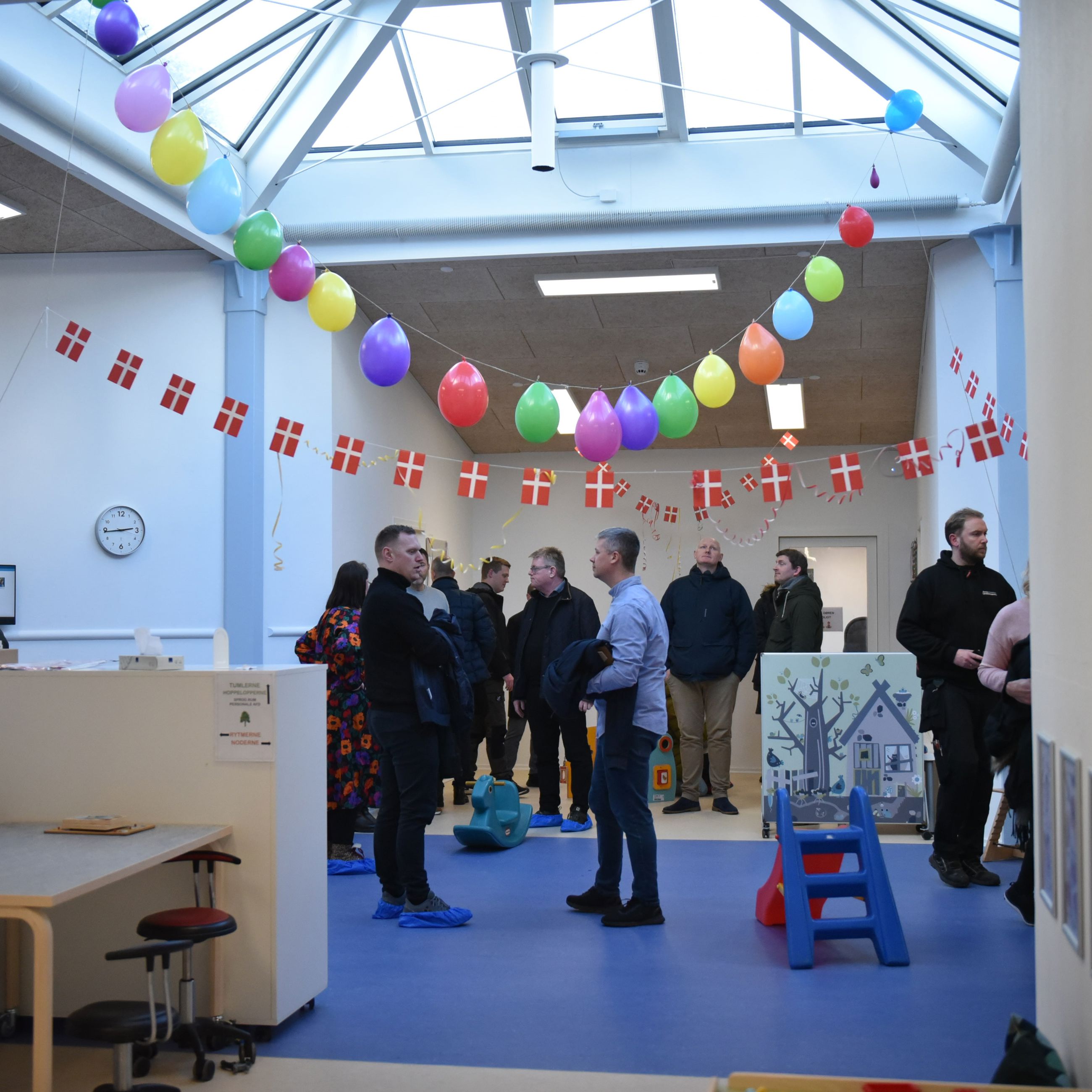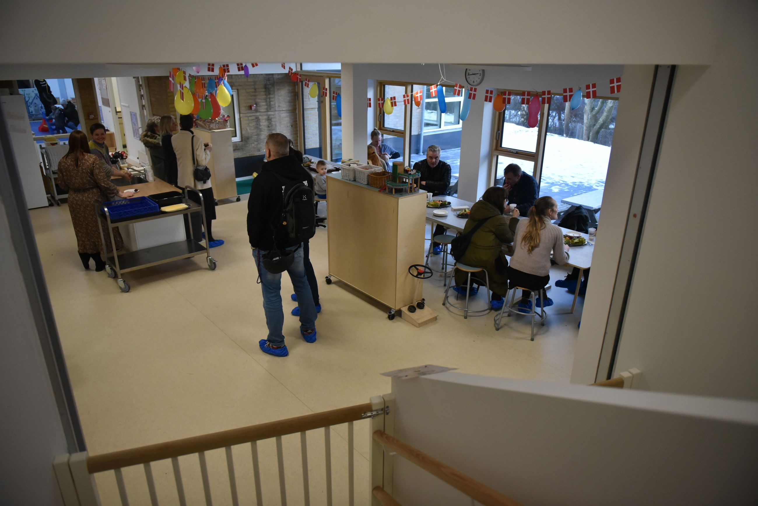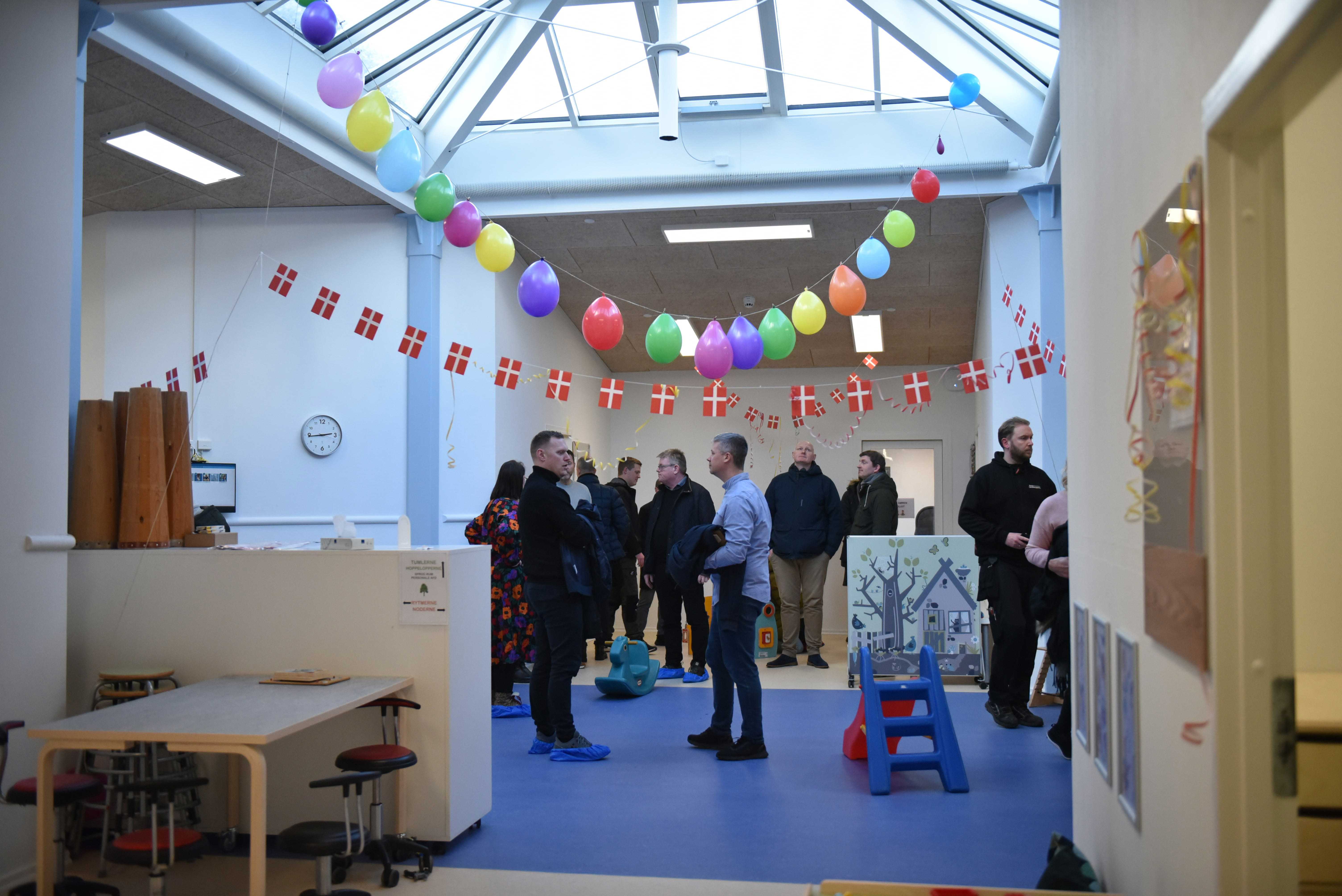 Der var pyntet med flag og rødt bånd ved Børnehuset Elmehaven torsdag 8. februar 2024, hvor børn og personale stod klar til at tage imod gæster. En tilbygning og ombygning af institutionen var blevet færdig, og det skulle fejres ved en officiel indvielse med borgmesterbesøg, taler, snorklip og rundvisning efterfulgt af kaffe og kage.