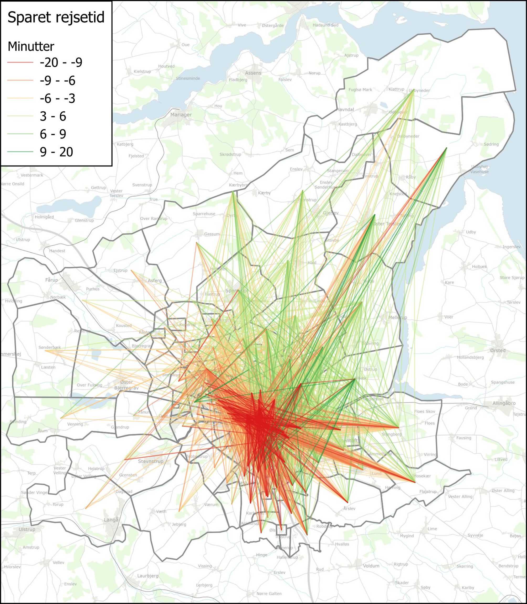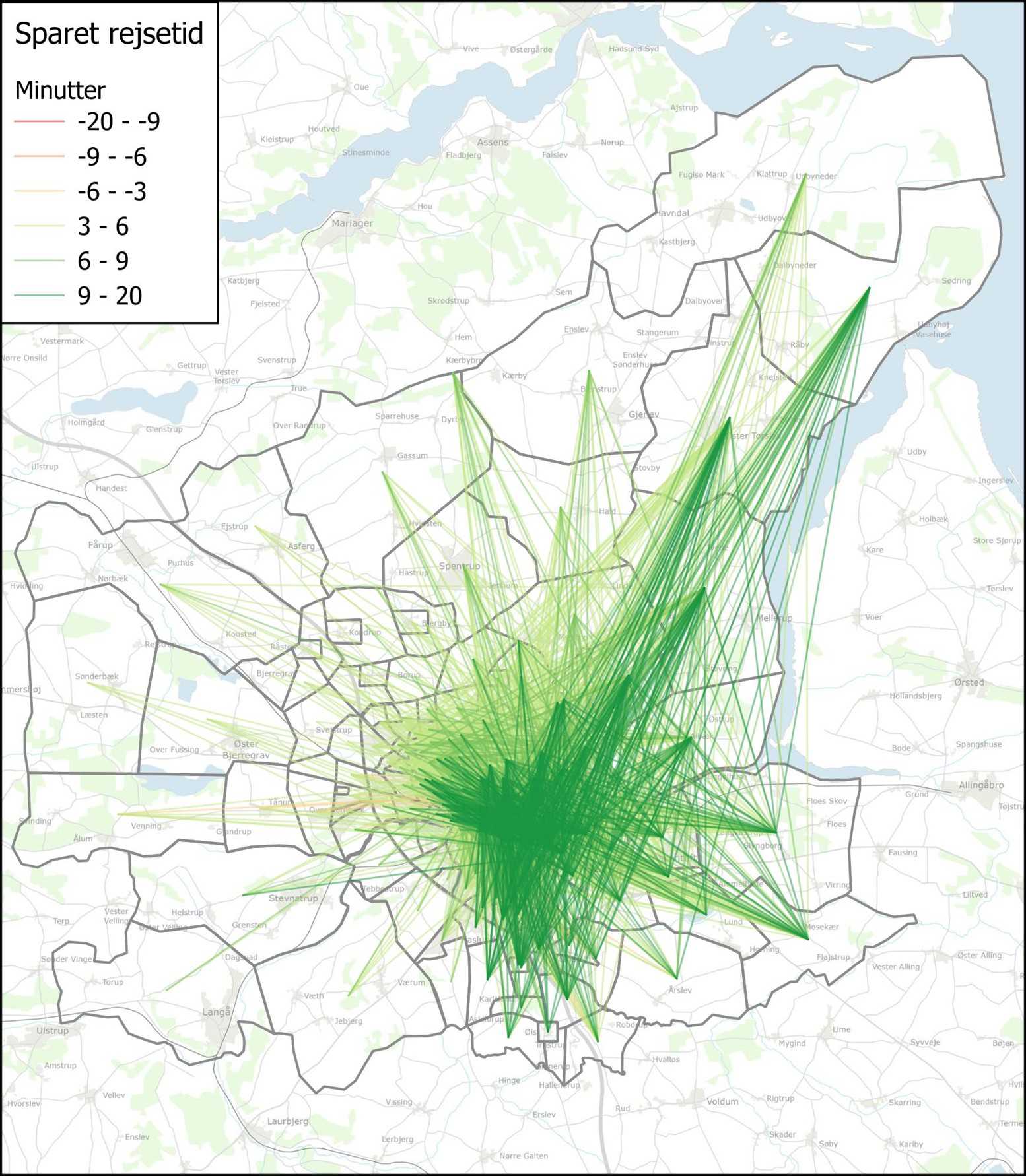 Figuren viser sparet rejsetid mellem de forskellige zoner i kommunens trafikmodel i forhold til i dag, når Klimbroen er etableret. Figuren viser, at der er en tidsbesparelse fra så godt som alle zoner med undtagelse af ganske lidt øst-vestgående trafik. I alt spares cirka 2.500 timers rejsetid dagligt, når Klimabroen er etableret.
