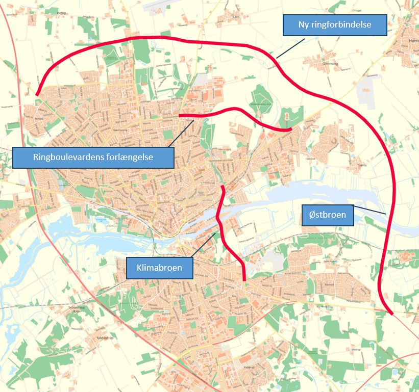 Alle de viste linjer på kortet er som udlagt i kommuneplanen. Der er tale om følgende projekter: Klimabroen, Østbroen, Ringboulevardens forlængelse og ny ringforbindelse.