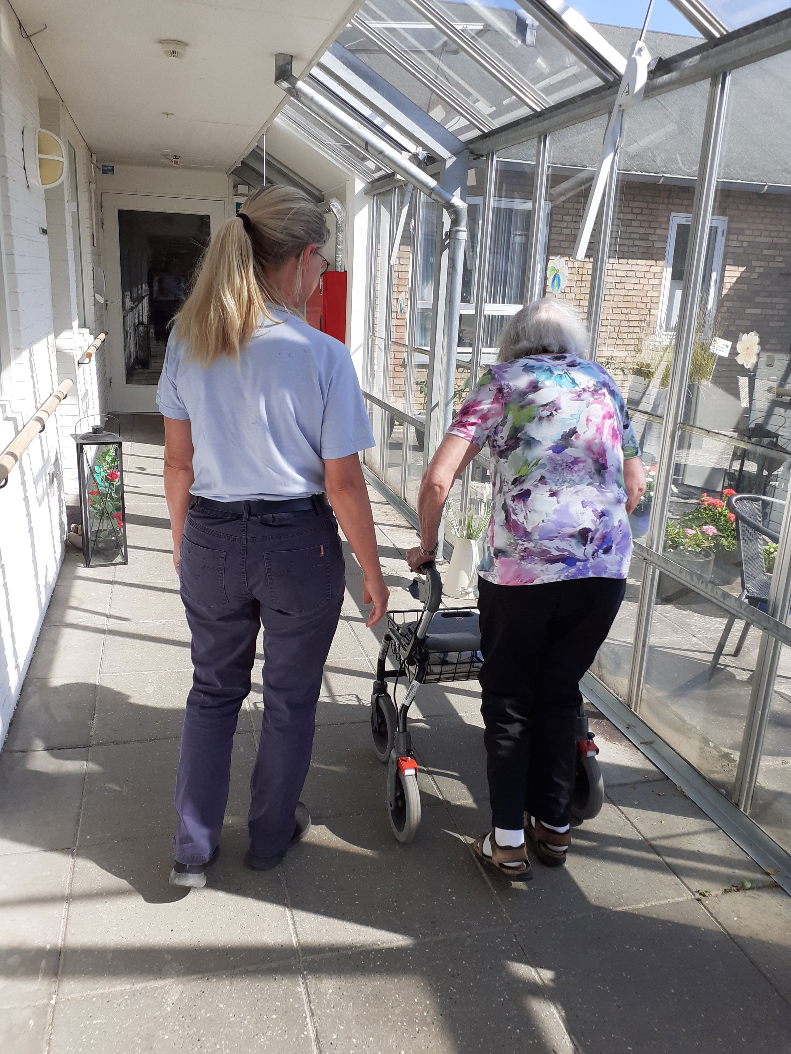 Med viljestyrke og en daglig indsats har Annelise, der bor på Dronningborg Plejecenter efter en skade trænet sig op til igen at kunne gå med sin rollator.