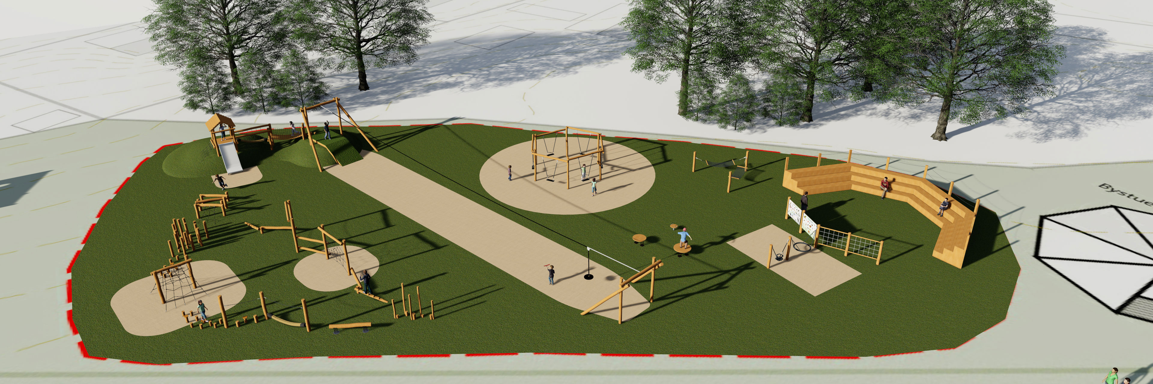 Den nye legeplads skal være for leg, bevægelse og læring, og den kommer til at bestå af en svævebane, rutsjebane, gynger, hængekøjer og en mindre amfiscene.