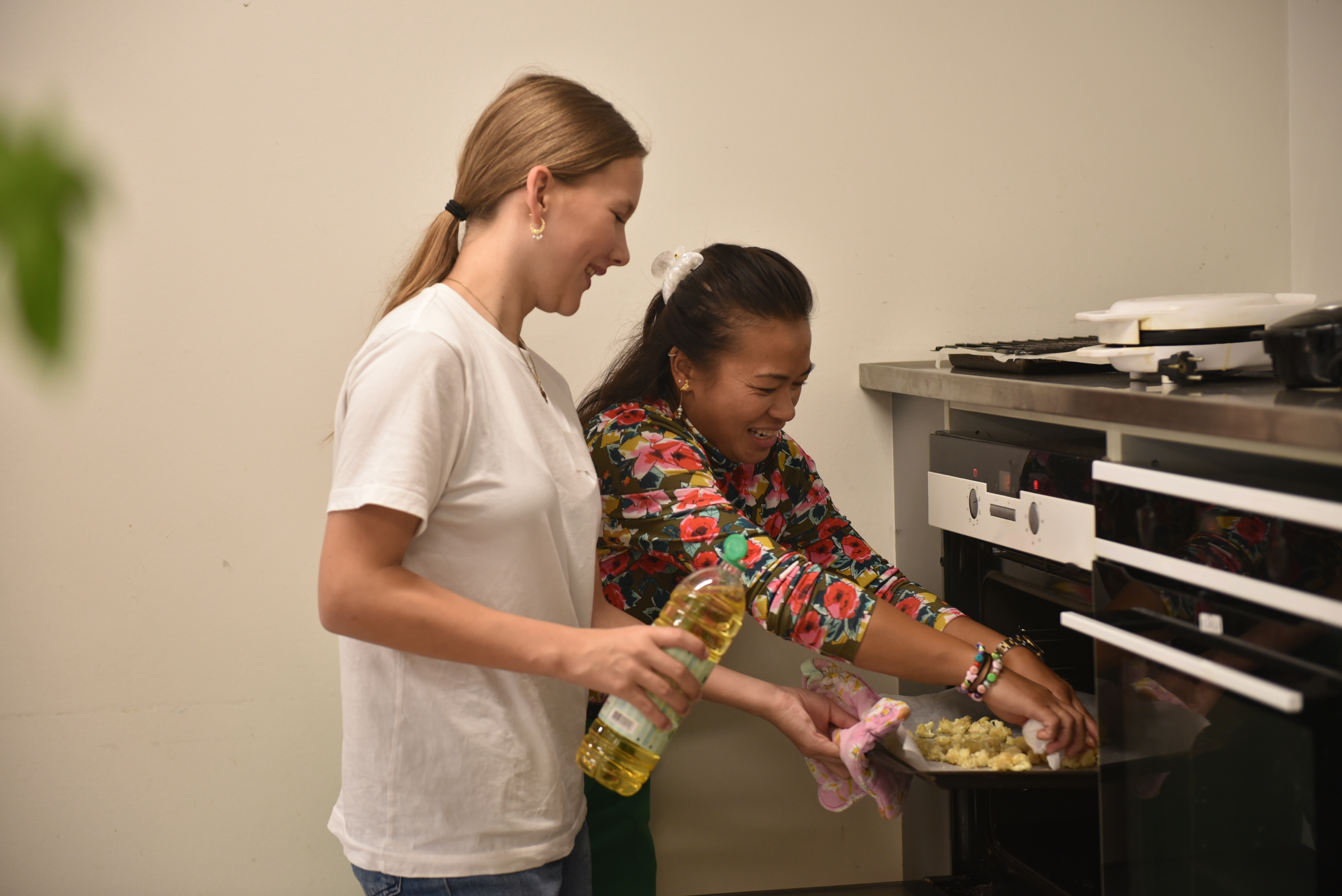 Eleverne blev først præsenteret for et væld af grøntsager, hvor de blev bedt om at vælge tre forskellige, som de skulle basere en ret på. Herefter skulle de finde en opskrift og selv lave maden. Hos venindeparret Maja Alstrup Clausen og Lejla Bender fra 8.A faldt valget på blomkålspopcorn og kartoffelrösti med dip lavet helt fra bunden.