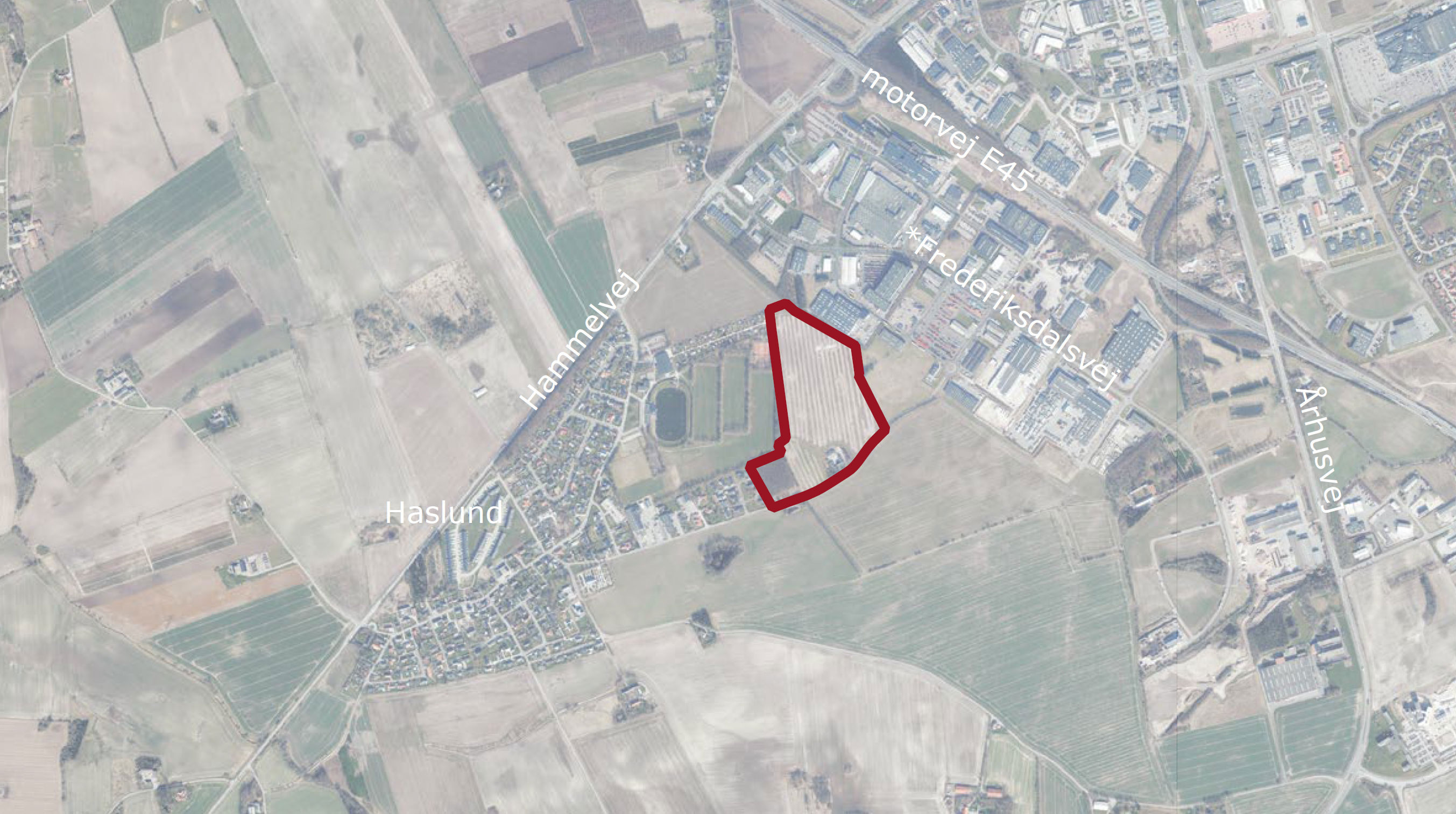 Det nye forslag til en lokalplan omfatter primært ejendommen Haslund Klostervej 43, der i dag bliver brugt til landbrugsdrift og hestehold. Her vil den eksisterende bebyggelse blive revet ned i forbindelse med byggemodning af området – og i stedet vil lokalplanforslaget give mulighed for at opføre op mod 100 nye boliger i to delområder.