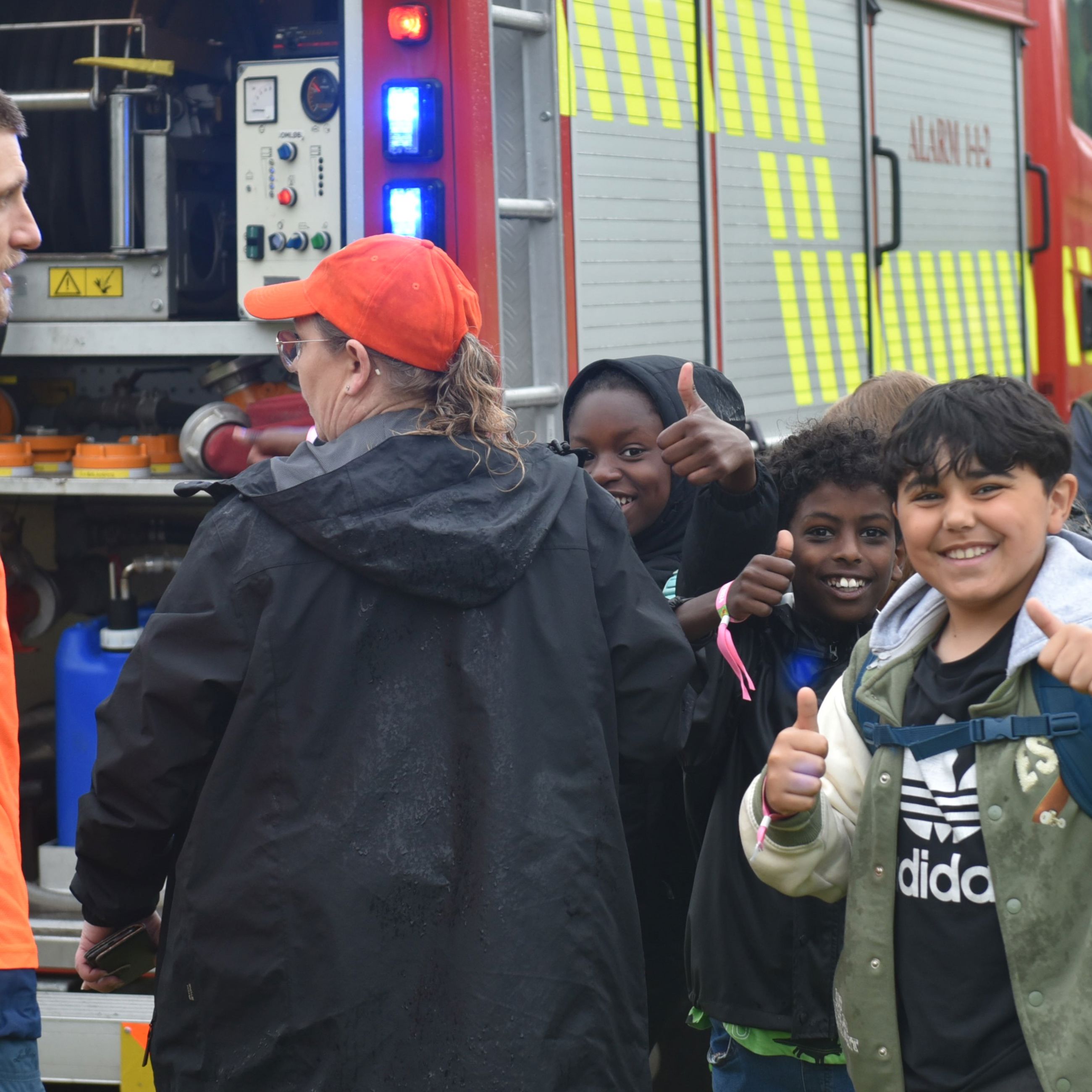 Ind rullede to ambulancer fra Sommersamaritterne og en brandbil med brandkadetter, der senere blev en del af de omfattende aktiviteter på dagen.