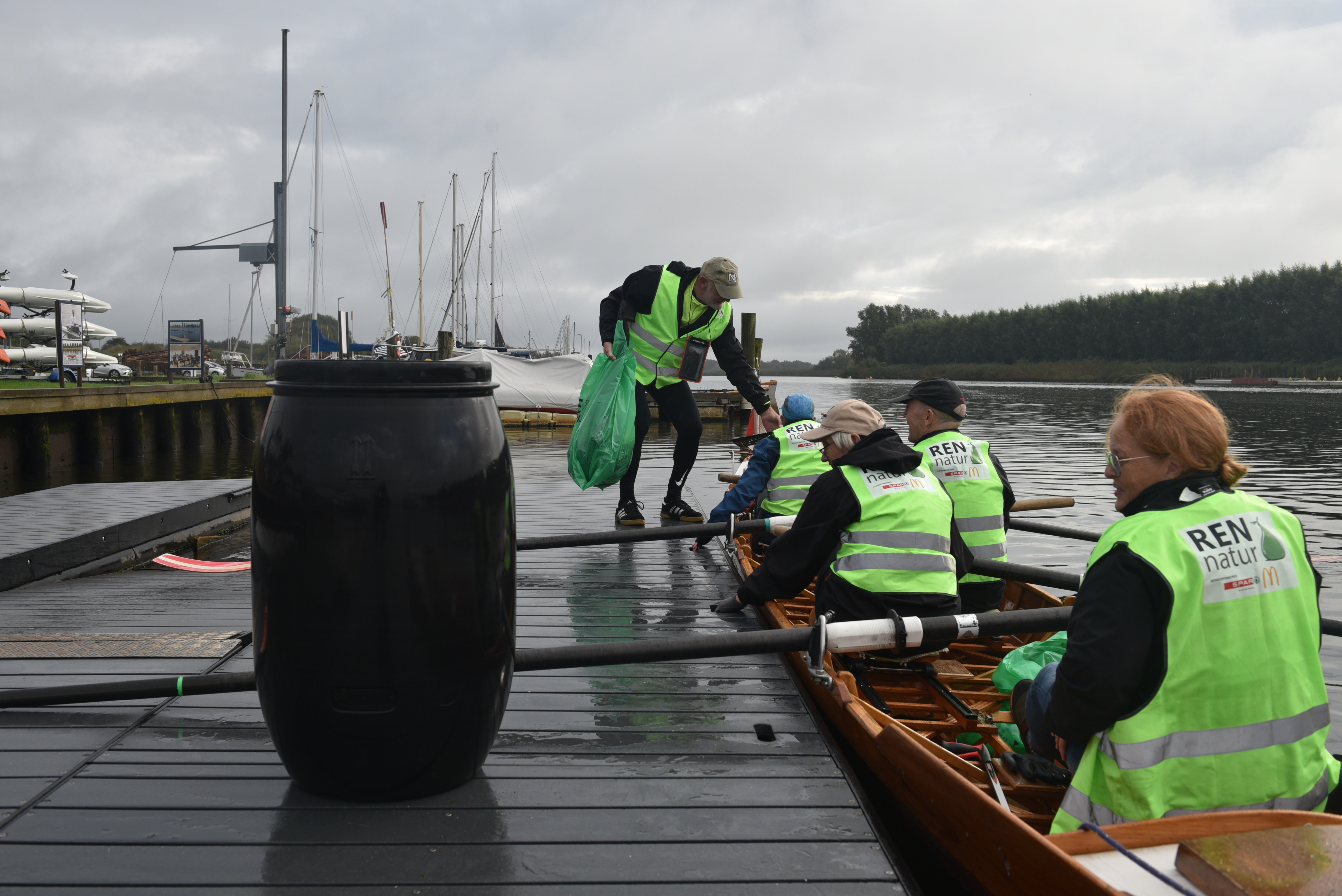 Dagens tur på Gudenåen krævede lidt mere og andet udstyr, end roerne normalt har med om bord. Både affaldssække, snappere og handsker var pakket, og roerne selv havde iført sig gule veste med teksten 'Ren Natur' på ryggen.
