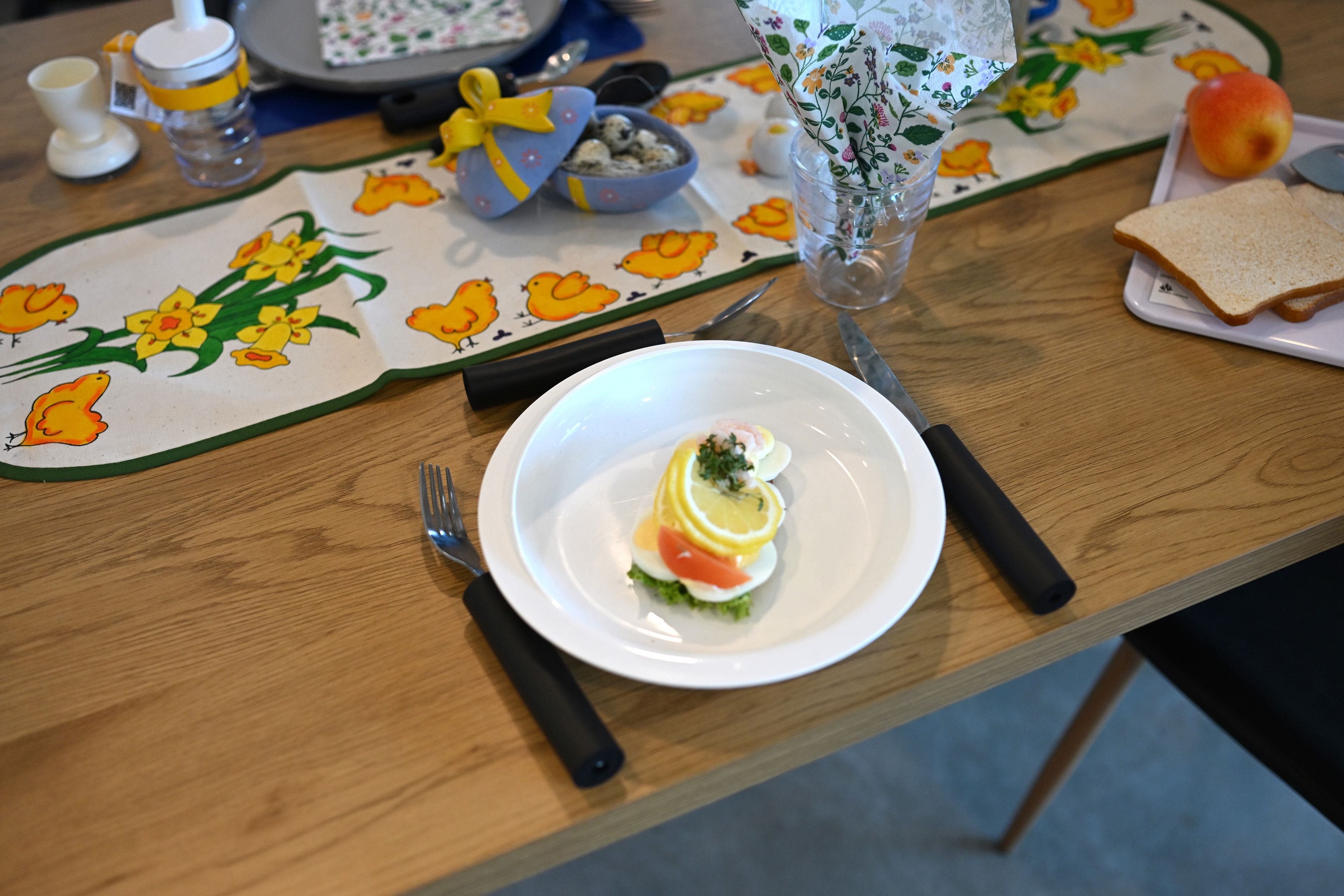 I Udstillingshuset Omsorg kan du komme forbi – alene eller sammen med en pårørende – og se og afprøve forskellige hjælpemidler. Her kan du blandt andet se og afprøve bestik med ergonomiske greb, let service og tallerkener, der står stabilt og hjælper med at holde maden på plads. Vi står klar til at fortælle om mulighederne og give råd om hjælpemidler, der kan gøre både påskefrokosten og hverdagens måltider lettere.