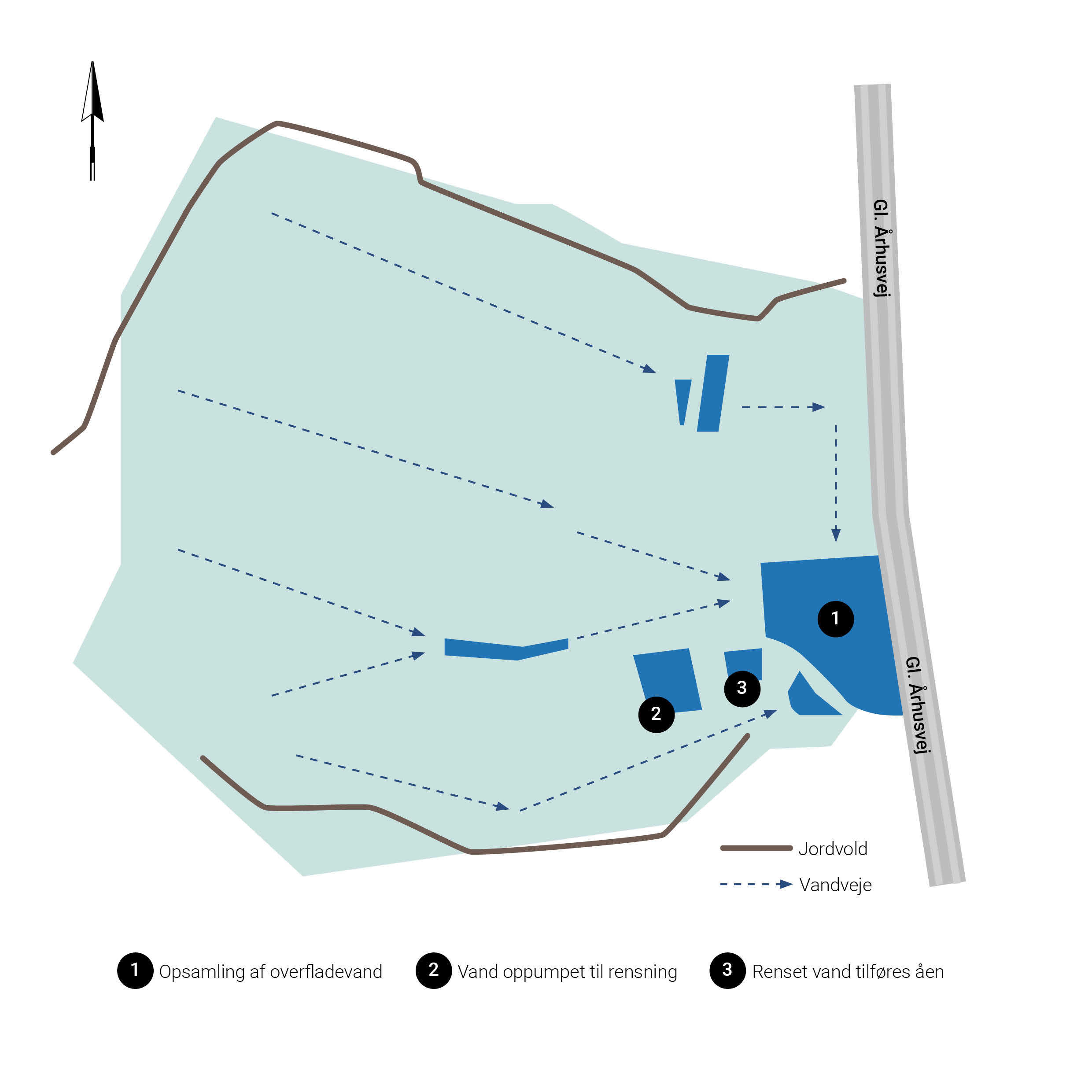Samtidig er der opbygget et voldanlæg rundt om jordskredsområdet, som vil sikre, at overfladevand bliver på grunden. Inde på grunden er terrænet nu blevet tilpasset, så vandet løber til et stort bassin. Herfra pumpes det videre til renseanlægget, hvor rensningen finder sted.