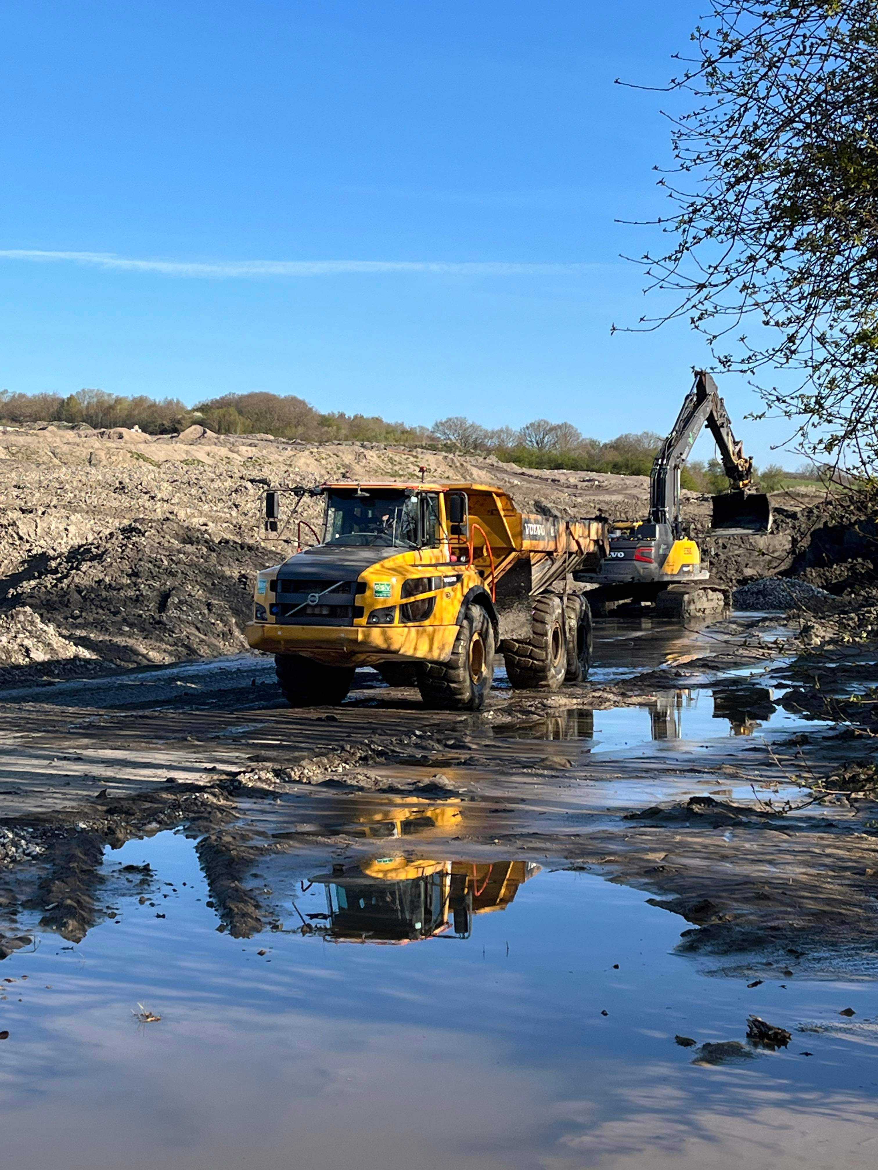 Der graves med en gravemaskine, 3 dumpere og 1 indbygningsmaskine og lige nu er forventningen, at der er gravet fra syd til i løbet af uge 17.