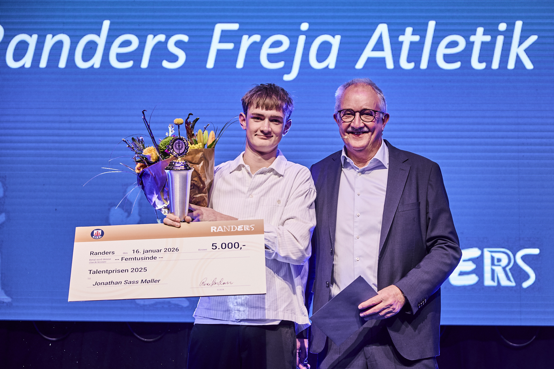 René Skjøde Andersen, formand for SIKR, overrækker Talentprisen til Jonathan Sass Møller fra Randers Freja Atletik og Motion.