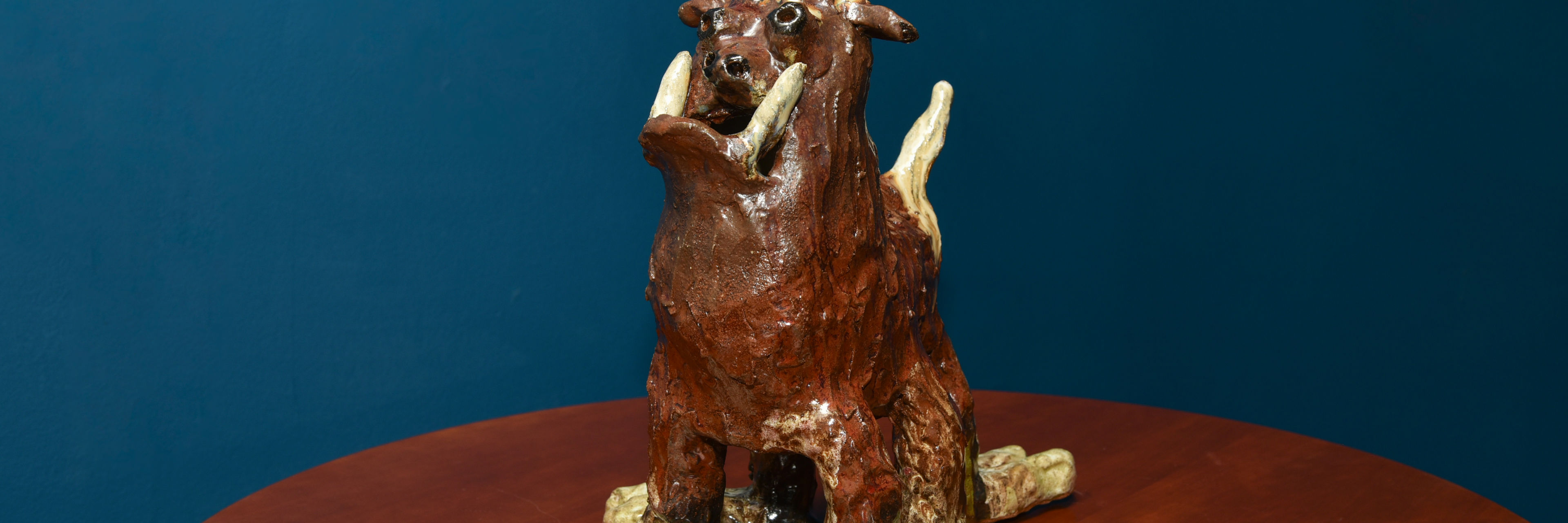 Kenneth Rasmussens værk til Dronningen består af en keramisk skulptur, der forestiller en af hundene i H. C. Andersens eventyr "Fyrtøjet".