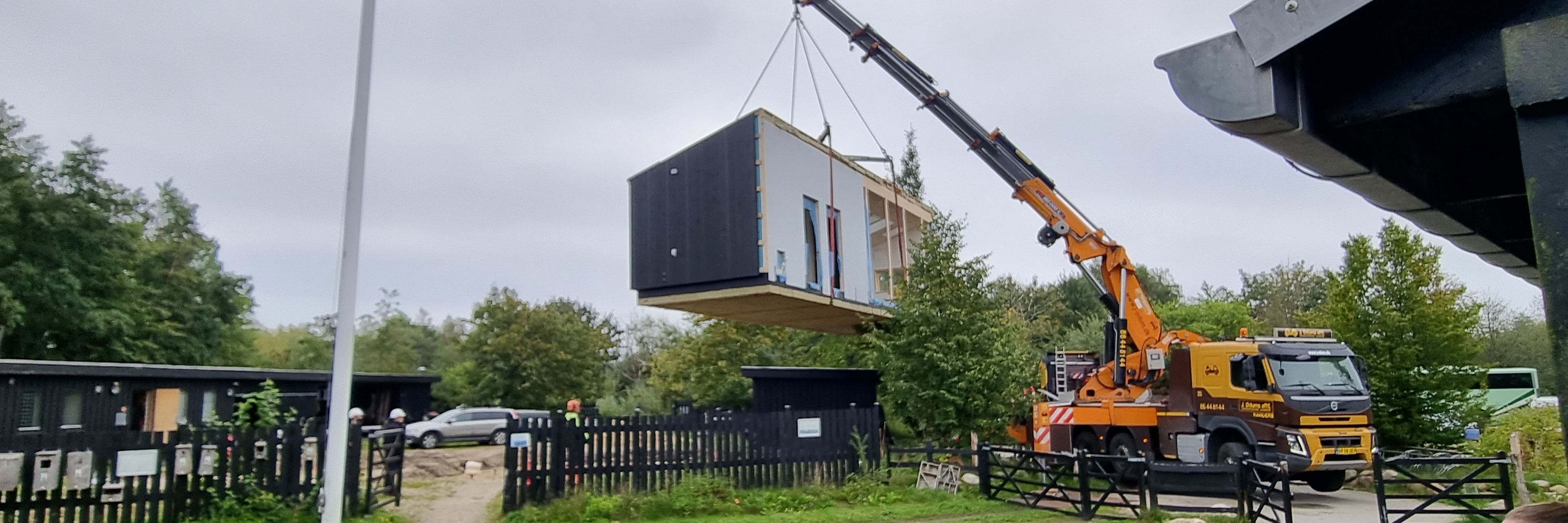 Randers Naturcenter har netop fået hejst de to moduler ind, som kommer til at udgøre den nye personalebygning i tilknytning til naturcentret.