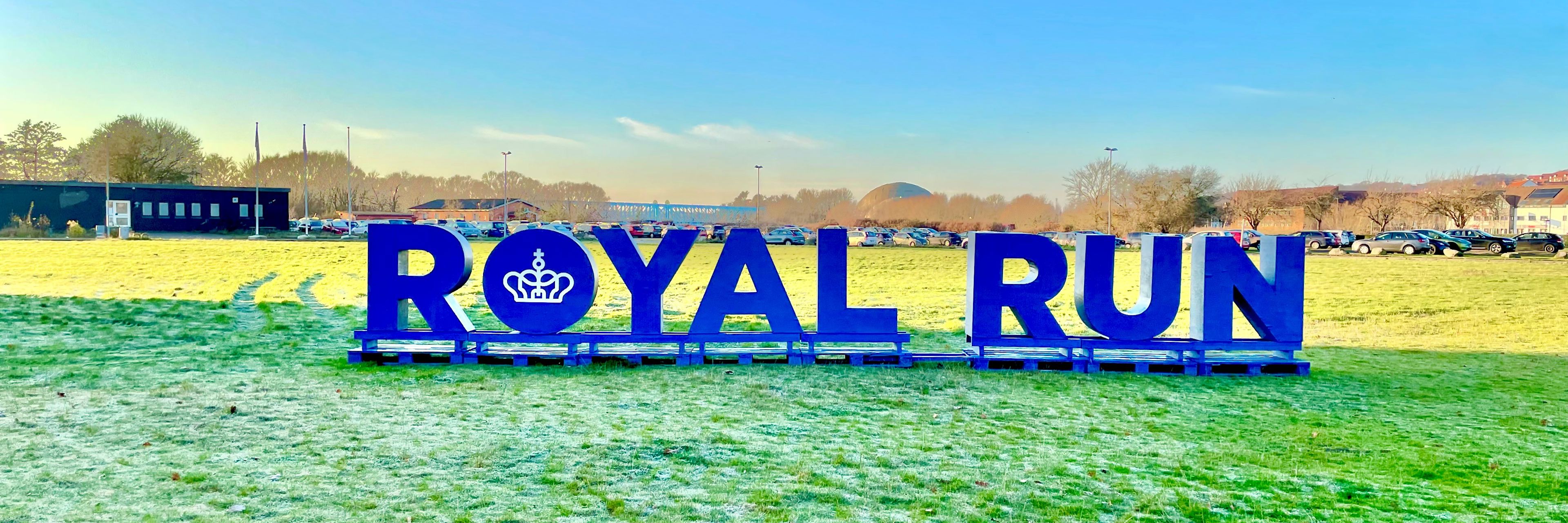 Store kongeblå Royal Run-bogstaver pryder plænen på Brotoften ved krydset Grenåvej/Aarhusvej. Fra torsdag eftermiddag, når mørket falder på, vil der også være lys i dem.