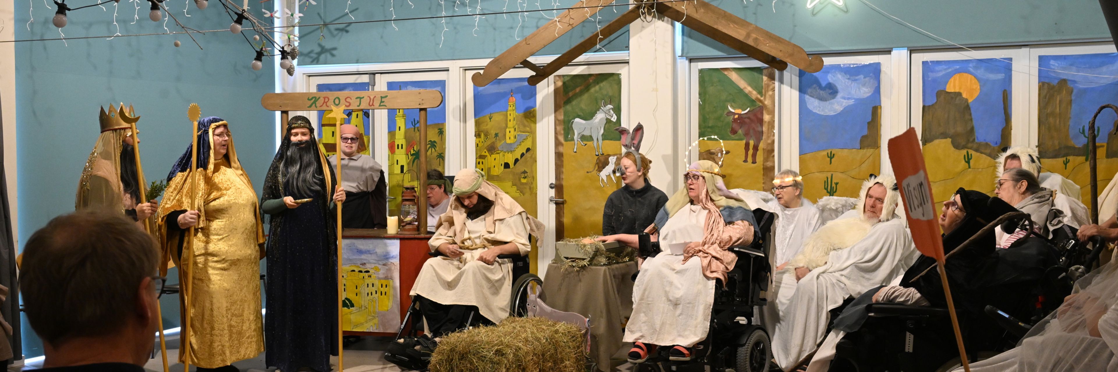 Årets krybbespil blev fremført første søndag i advent, hvor beboere og medarbejdere indtog rollerne som Maria, Josef, hyrder og engle, mens andre stod for lys og lyd og for at byde publikum velkommen. Det blev fremført for fuldt hus af pårørende, som kvitterede med hujen, grin og klapsalver.