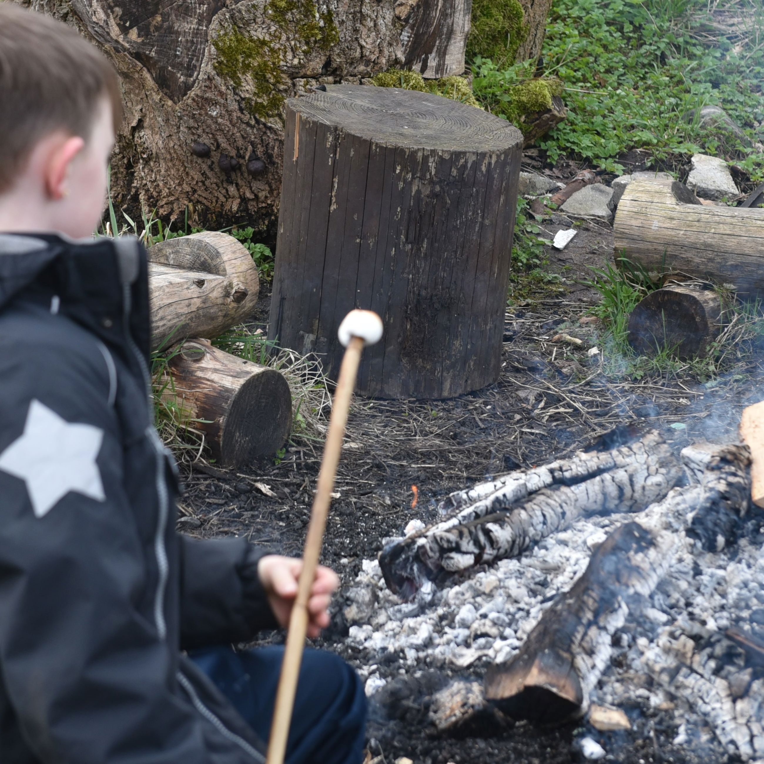 Efter veloverstået skattejagt i naturen kunne familierne hvile benene og lune sig omkring bål, hvor der blev ristet skumfiduser og spist kiks til.